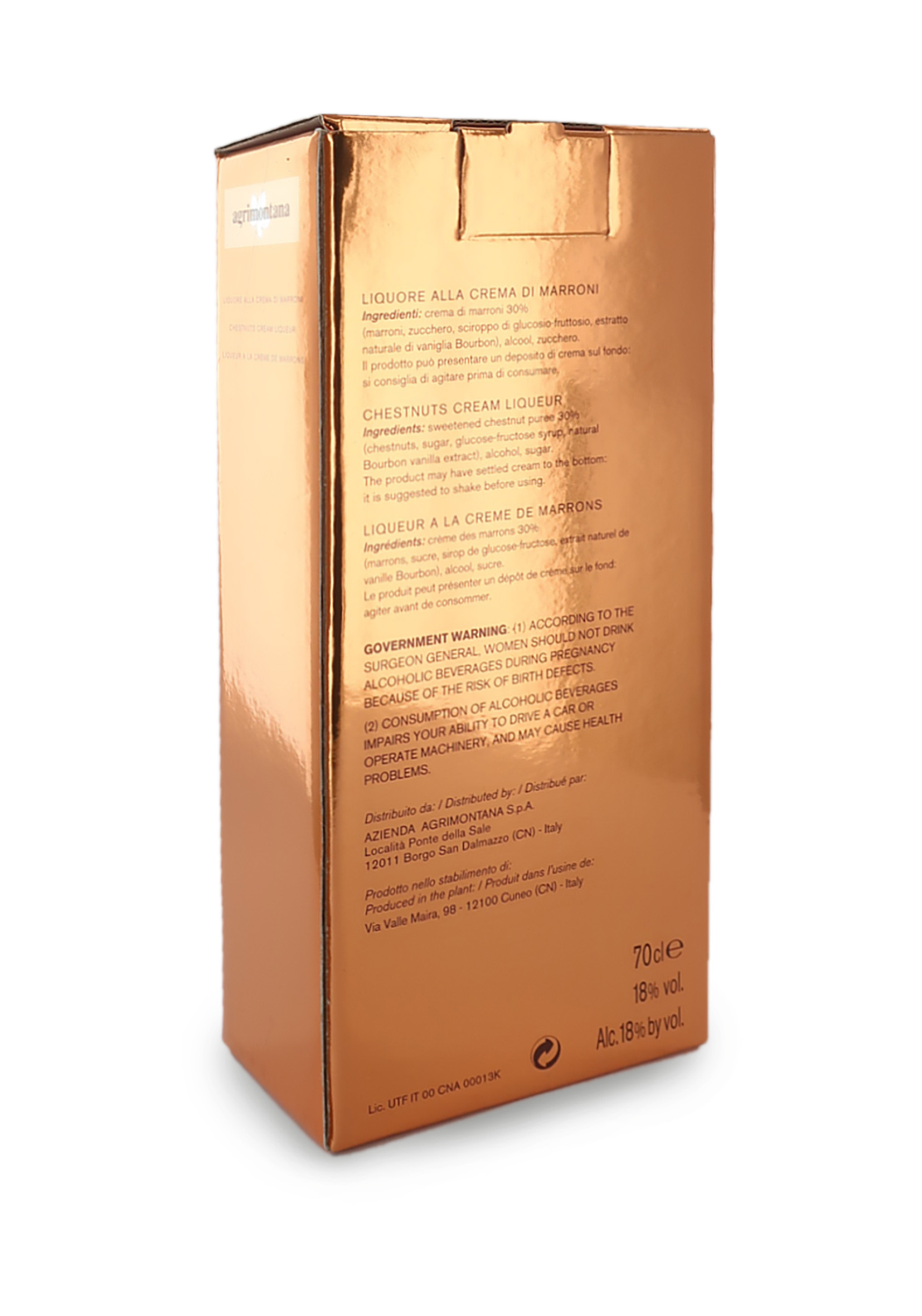 Astuccio con bottiglia in vetro da 70 cl di liquore alla crema di marroni.