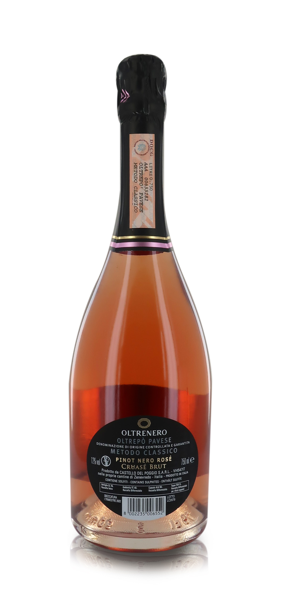 Classificazione: Oltrepò Pavese DOCG / Zona di produzione: Zenevredo, Oltrepò Pavese / Uve: 100% Pinot Nero / Note di degustazione: - Colore: Rosa vivo dai riflessi brillanti con un perlage finissimo e una spuma soffice e persistente. / - Profumo: Fragrante bouquet che si apre a piacevoli note agrumate come il mandarino e a caratteristici sentori di piccoli frutti rossi, dal lampone, al ribes fino alle fragole selvatiche. Il finale è elegante e ricorda la crosta di pane. / - Sapore: In bocca risulta deciso, fresco e con ottima sapidità con sensazioni sul finale che riprendono il bouquet.