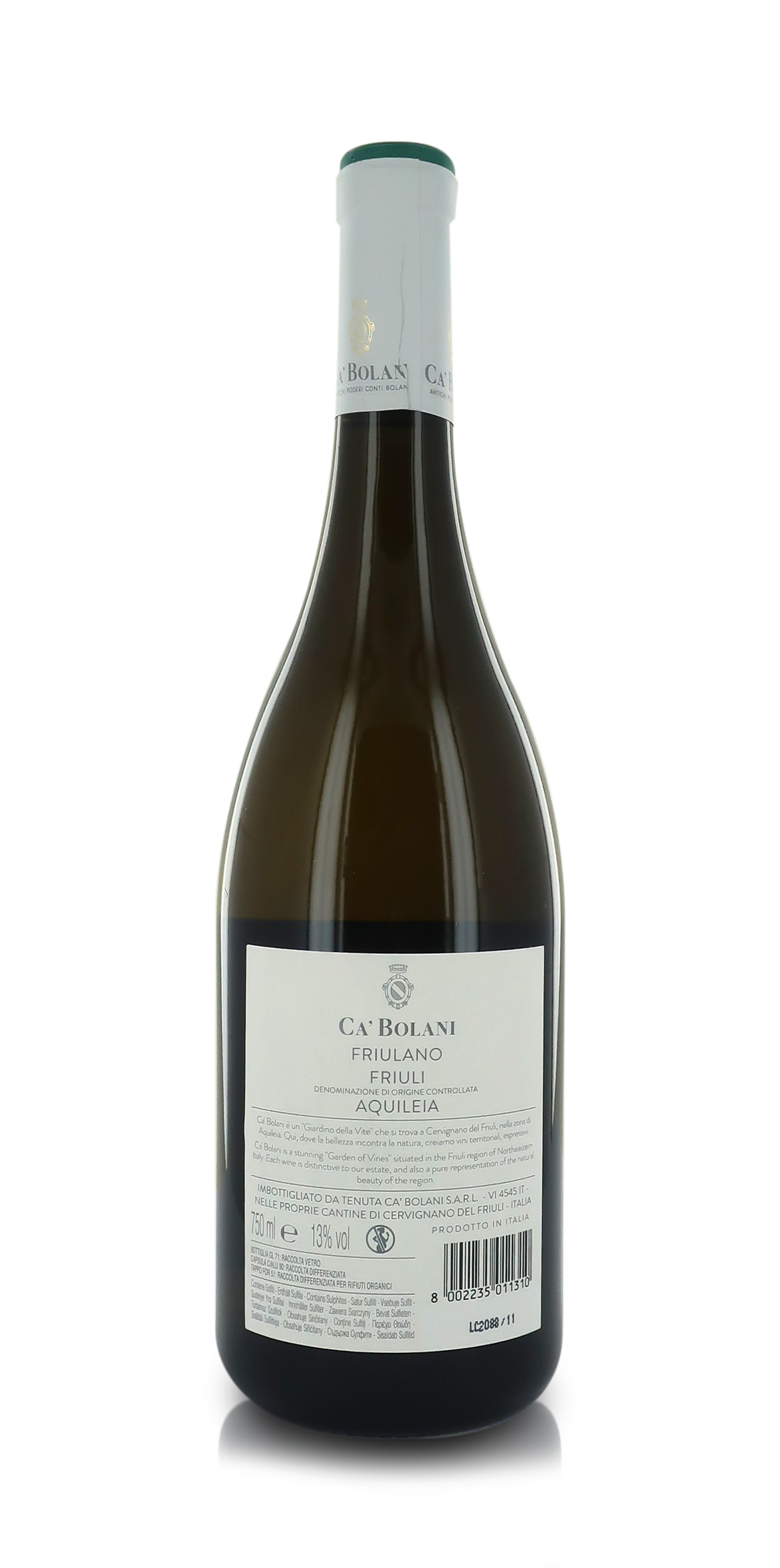 Confezione da 6 bottiglie, 750ml l’una. Le uve appena raccolte vengono trasferite alla cantina per una pigiatura soffice e delicata. La fermentazione avviene a temperatura controllata di circa 18 °C, al fine di meglio preservare il fruttato e le migliori caratteristiche organolettiche del vino. Segue un periodo di affinamento sulle fecce fine per conferire struttura al vino. Classificazione: Friuli DOC Aquileia / Zona di Produzione: Aquileia, Friuli / Uve: Friulano / Colore: giallo paglierino con brillanti riflessi dorati. / Profumo: un delicato fruttato penetra all’olfatto. Le note di mela golden, agrumi e mandorla fresca sono in perfetto amalgama coi sentori minerali di pietra focaia. / Sapore: al palato la corrispondenza con le note olfattive è impeccabile: ampio, con buona acidità che dona freschezza e fragranza. Il finale è intenso e persistente e ricorda la mandorla. / Abbinamenti: ottimo aperitivo, è tradizionale vino fresco da tutto pasto. Trova eccellenti combinazioni con sformati di verdura, salumi delicati e piatti a base di pesce. CONTIENE SOLFITI. ATTENZIONE: EVENTUALE INDICAZIONE DI ANNATA IN TESTI E/O FOTO È MERAMENTE INDICATIVA; L'ANNATA INVIATA, SOGGETTA A DISPONIBILITÀ, POTRÀ VARIARE DA QUELLA IN FOTO O NEI TESTI, SENZA QUESTO RAPPRESENTARE UN ERRORE O UN DIFETTO DELL'ORDINE. Ca' Bolani - Cervignano del Friuli, Udine, Italia. Percorsa da 999 cipressi che celebrano e proteggono una straordinaria biodiversità, Ca' Bolani è una tenuta dove la vite e la natura prosperano in perfetta sintonia. Incastonata tra le Alpi e il mare del Friuli a Aquileia, in un territorio dove la viticultura fu introdotta sin dall'epoca romana, la tenuta beneficia di condizioni ideali per la produzione vitivinicola: le brezze marine estive, la protezione offerta dalle Alpi, le forti escursioni termiche, la varietà dei terreni che digradando verso il mare.