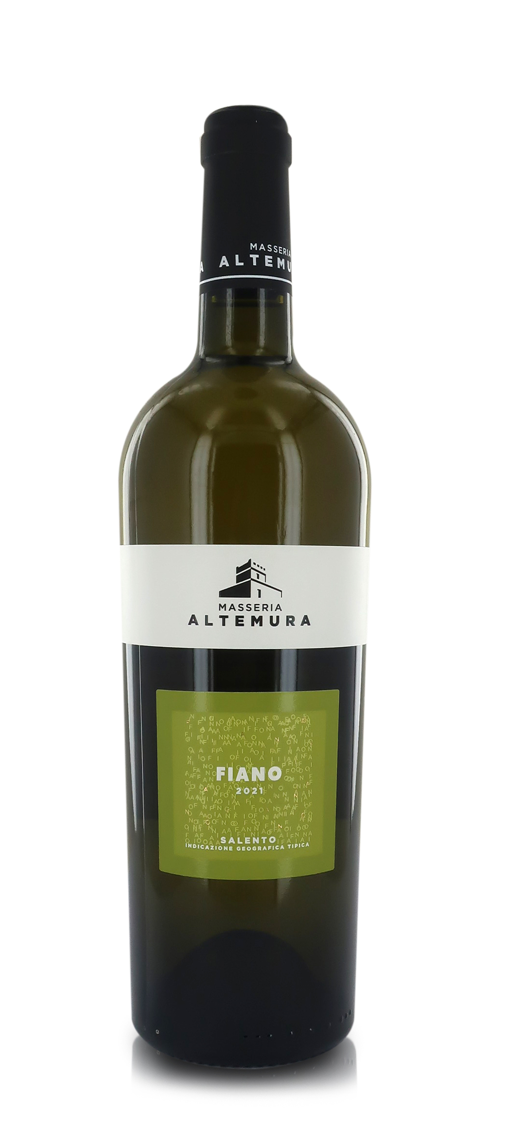 Vino pugliese Fiano del Salento IGT, bottiglia da 750 ml. Le uve, raccolte a perfetta maturazione, vengono pigiate delicatamente ed il mosto viene separato con presse soffici a polmone. Il vino fermenta per 7/10 giorni in vasche di acciaio inox a una temperatura media di 18 °C e sosta per 2/3 mesi sulle fecce fini. Segue un periodo di affinamento in bottiglia. Classificazione: Salento IGT / Zona di produzione: Provincia di Brindisi / Uve: 100% Fiano / Note di degustazione – Colore: giallo paglierino intenso. / Profumo: al naso svela piacevoli note di frutta a polpa gialla e fiori bianchi. / Sapore: perfetto equilibrio tra intensità, freschezza e mineralità, in un corpo misurato. Al palato tornano le sensazioni di frutti e fiori percepiti al naso, in perfetta continuità gusto-olfattiva. / Abbinamenti: piatti di pesce saporito del Mediterraneo o piatti a base di legumi.