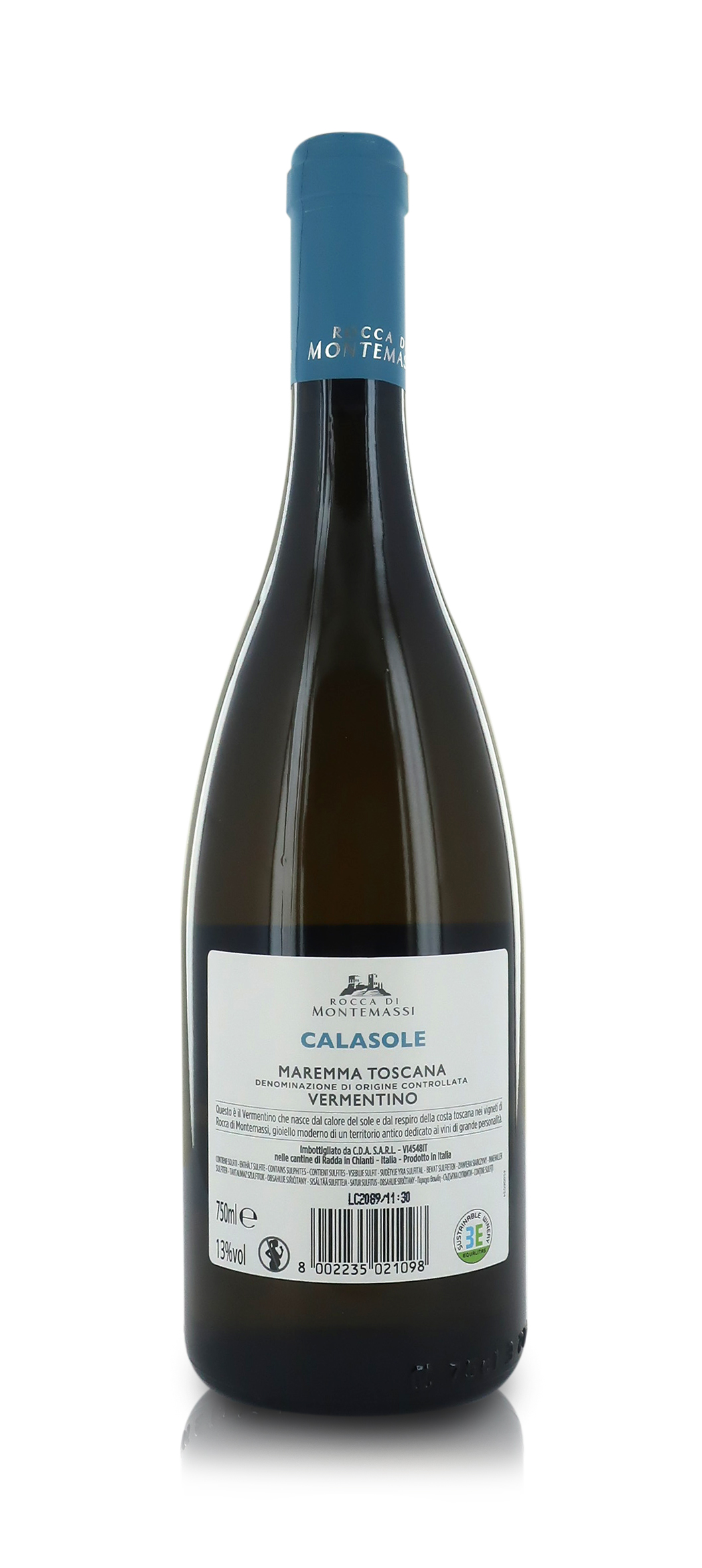 Confezione da 6 bottiglie, 750 ml l’una. “Calasole” è il nome della brezza marina che si alza al “calar del sole” sulla costa maremmana. Prodotto con 100% uve Vermentino, vitigno che identifica l’area, affina esclusivamente in acciaio, per preservarne ed enfatizzarne i freschi aromi varietali. Classificazione: Maremma Toscana DOC / Uve: 100% Vermentino / Colore: Giallo paglierino brillante. / Profumo: Intensi sentori di fiori bianchi con fresche note di mela renetta, agrumi ed erbe aromatiche. / Sapore: Consistente e fresco, con caratteri di agrumi e note minerali e ammandorlate. CONTIENE SOLFITI. ATTENZIONE: EVENTUALE INDICAZIONE DI ANNATA IN TESTI E/O FOTO È MERAMENTE INDICATIVA; L'ANNATA INVIATA, SOGGETTA A DISPONIBILITÀ, POTRÀ VARIARE DA QUELLA IN FOTO O NEI TESTI, SENZA QUESTO RAPPRESENTARE UN ERRORE O UN DIFETTO DELL'ORDINE. Rocca di Montemassi è una Wine Farm nel cuore della Maremma Toscana più vera, alle pendici di Montemassi, dove nascono i grandi vini di Toscana. Rocca di Montemassi racconta una Toscana irriverente e audace, dove le emozioni vivono del fuoco della terra e della purezza del mare. Dal Vermentino ai Blend di Maremma, Rocca di Montemassi rappresenta un nuovo traguardo del vino toscano e la prova dell’eccellenza di un territorio creativo. Rocca di Montemassi svolge la sua attività rispettando principi della sostenibilità ambientale, etica e economica.