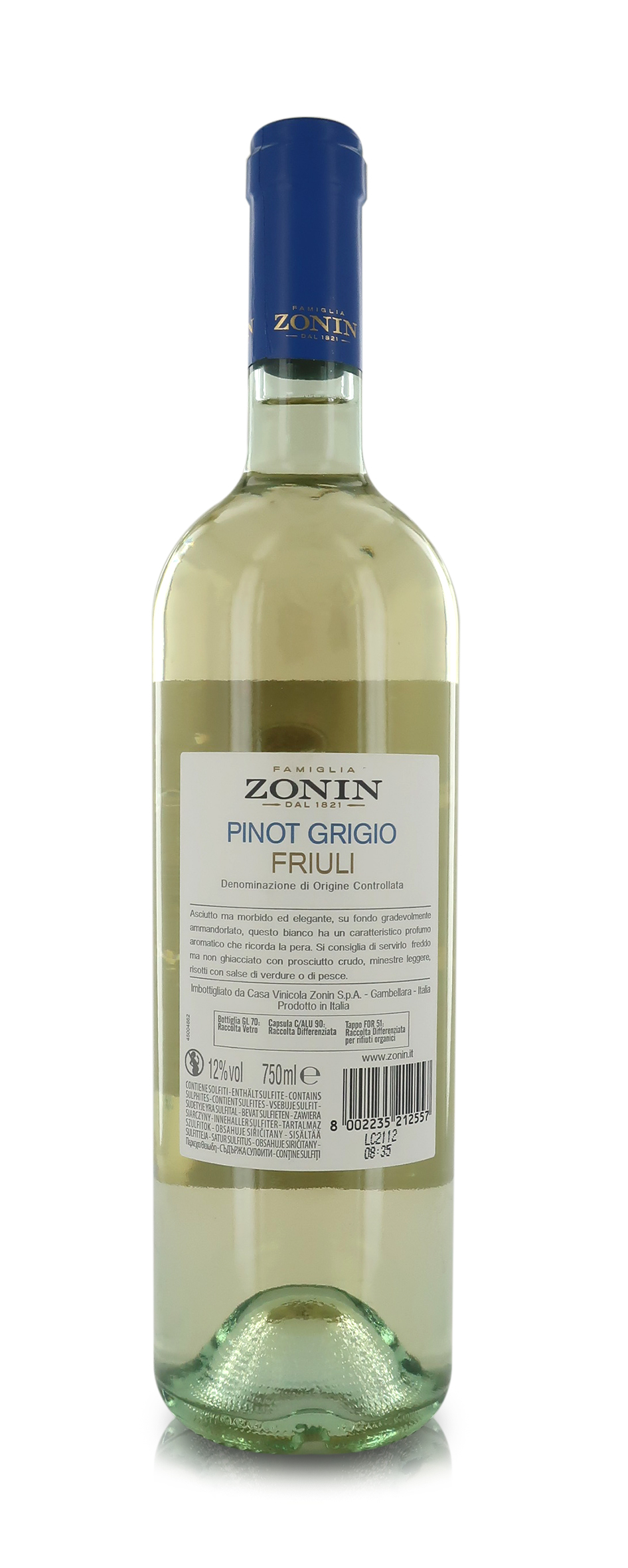 6 bottiglie da 750 ml. Pinot Grigio dal profumo fine, con note ampie e fruttate di mela renetta e floreali di ginestra. Le uve appena colte vengono sottoposte a pressatura soffice e il mosto limpido è posto a fermentare per 10 giorni a temperatura controllata di 18 °C per esaltarne gli aromi e le qualità organolettiche. Il vino resta a contatto con i propri lieviti per almeno 3 mesi. Vino da aperitivo, si abbina ottimamente con primi piatti leggeri, carni bianche, pesce e frutti di mare anche crudi. Classificazione: Friuli DOC / Territorio: Cervignano del Friuli / Uve: Pinot Grigio / Colore: giallo paglierino con leggeri riflessi dorati. / Profumo: fine con note ampie fruttate di mela renetta e floreali di ginestra. / Sapore: leggermente secco ed estremamente fresco; la sua fragranza e il buon equilibrio lo rendono particolarmente raffinato. / Temperatura di servizio: 10-12 °C.