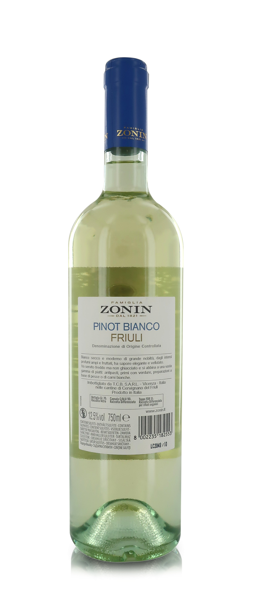 6 bottiglie da 750 ml. Pinot Bianco dai sentori fruttati che esprimono note di frutta fresca e di frutta secca. Le uve vendemmiate a completa maturazione sono avviate alla pigiatura delicata e alla pressatura soffice con presse orizzontali. La fermentazione avviene a temperatura controllata, a cui segue una lunga permanenza sui propri lieviti naturali fino al raggiungimento della perfetta armonia. È un ottimo aperitivo. Accompagna in modo fine ed elegante un intero pasto. Raccomandato in particolare con antipasti magri, primi piatti con salse delicate, con pesce e carni bianche. Classificazione: Friuli DOC / Territorio: Cervignano del Friuli / Uve: Pinot Bianco in purezza / Colore: bel colore giallo paglierino, luminoso e brillante. / Profumo: sentori fruttati, esprimono vene di frutta fresca e di frutta secca. / Sapore: secco, di delicata fragranza, retrogusto pulito, di gradevole persistenza. / Temperatura di servizio: 9-10 °C.