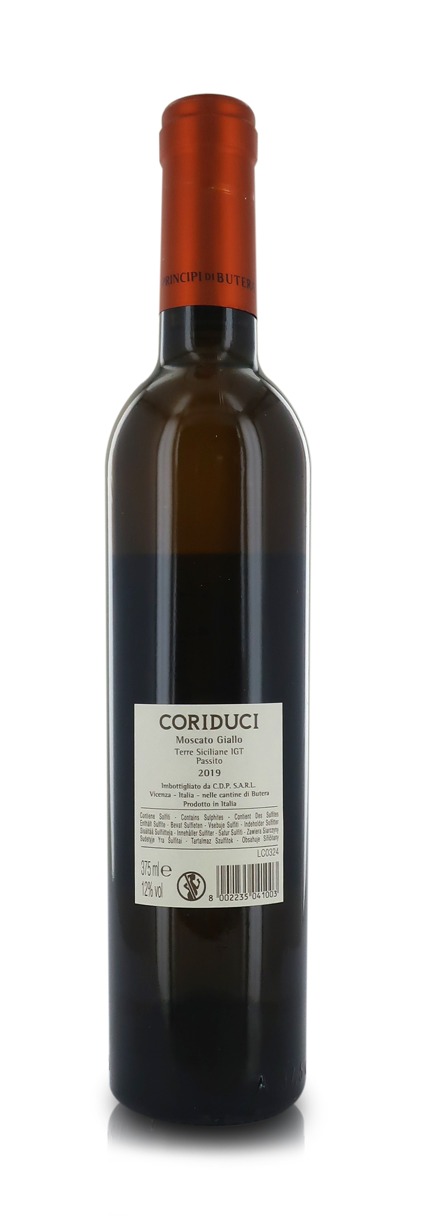 3 bottiglie da 375 ml l'una. Vino Passito "Coriduci" ottenuto da uve Moscato Giallo in comodo ed elegante astuccio, perfetto come idea regalo per gli amanti del passito. Il cuore dolce del Moscato dei Principi di Butera, in un passito che ha i profumi e la grazia dei fiori e dei frutti della Sicilia. Classificazione: Terre Siciliane IGT.