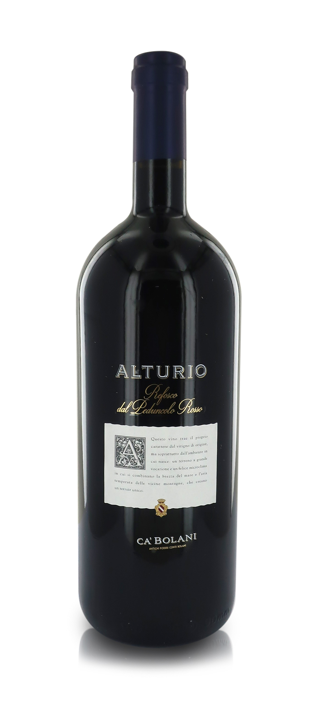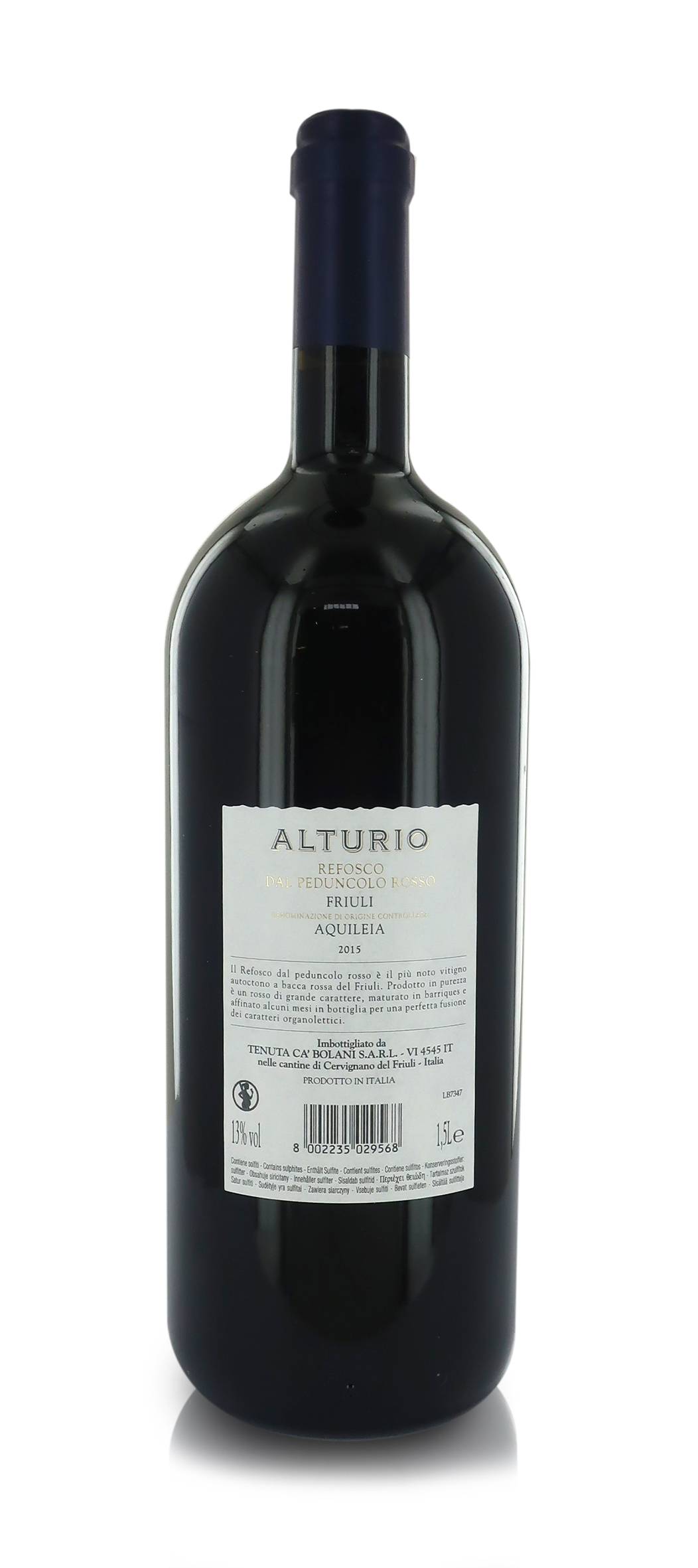 MAGNUM da 1,5 lt in SCATOLA DI LEGNO. Il vino Alturio vanta note di ciliegia e prugna, di tabacco conciato e legni antichi. Un Refosco dal Peduncolo Rosso – autoctono, totalmente friulano – che ritrova nella versione di Ca’ Bolani un’eleganza armonica tra la soavità del bouquet di profumi, la mineralità spiccata e un finale sostenuto. Classificazione: Friuli DOC Aquileia / Zona di produzione: Alture - Vigneti Molin di Ponte / Uve: 100% Refosco dal Peduncolo Rosso / Note di degustazione - Colore: rosso rubino intenso con brillante unghia violacea. - Profumo: al naso dominano le tipiche note di piccoli frutti rossi - more, lamponi, mirtilli. Caldi sentori di prugna e ciliegia sotto spirito si armonizzano con lievi note balsamiche. Nel finale vivaci accordi speziati si fondono con i ricordi olfattivi di liquirizia, vaniglia, caffè e cioccolato regalati dal lungo affinamento in legno. - Sapore: al palato si presenta pieno, rotondo, di grande struttura, con un ottimo equilibrio fra la naturale acidità del Refosco e la grande morbidezza dei tannini, riproponendo le note fruttate e gli accordi balsamici che si stemperano in un ritorno di spezie nel finale del sorso.
