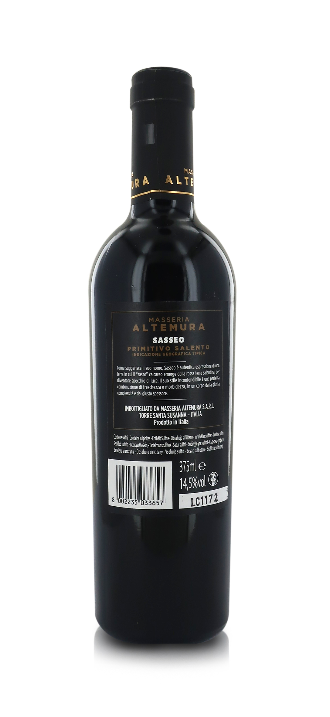 Confezione da 12 bottiglie, 375ml l’una. Nato dalla volontà di creare un Primitivo dalla spiccata personalità, Sasseo è oggi uno dei vini pugliesi più affermati nel panorama internazionale. Come suggerisce il suo nome, è diretta espressione di un terreno in cui il “sasso” calcareo emerge dalla rossa terra salentina, per diventare specchio di luce. Il suo stile inconfondibile è una perfetta combinazione di freschezza e morbidezza, in un corpo dalla giusta complessità e dal giusto spessore. Classificazione: Salento IGT / Zona di produzione: Provincia di Brindisi / Uve: 100% Primitivo / Note di degustazione – Colore: rosso rubino cupo e profondo / Profumo: al naso dispiega profumi intensi e pieni che richiamano la prugna, la confettura di frutta rossa con dolci accenti di spezie. / Sapore: vino di buon corpo, in bocca è avvolgente, caldo, morbido ed esprime un fruttato molto maturo, sostenuto da una piacevole trama di tannini dolci. / Abbinamenti: primi piatti saporiti, carni bianche e rosse alla brace o salsate, agnello al forno e formaggi stagionati ma non erborinati.