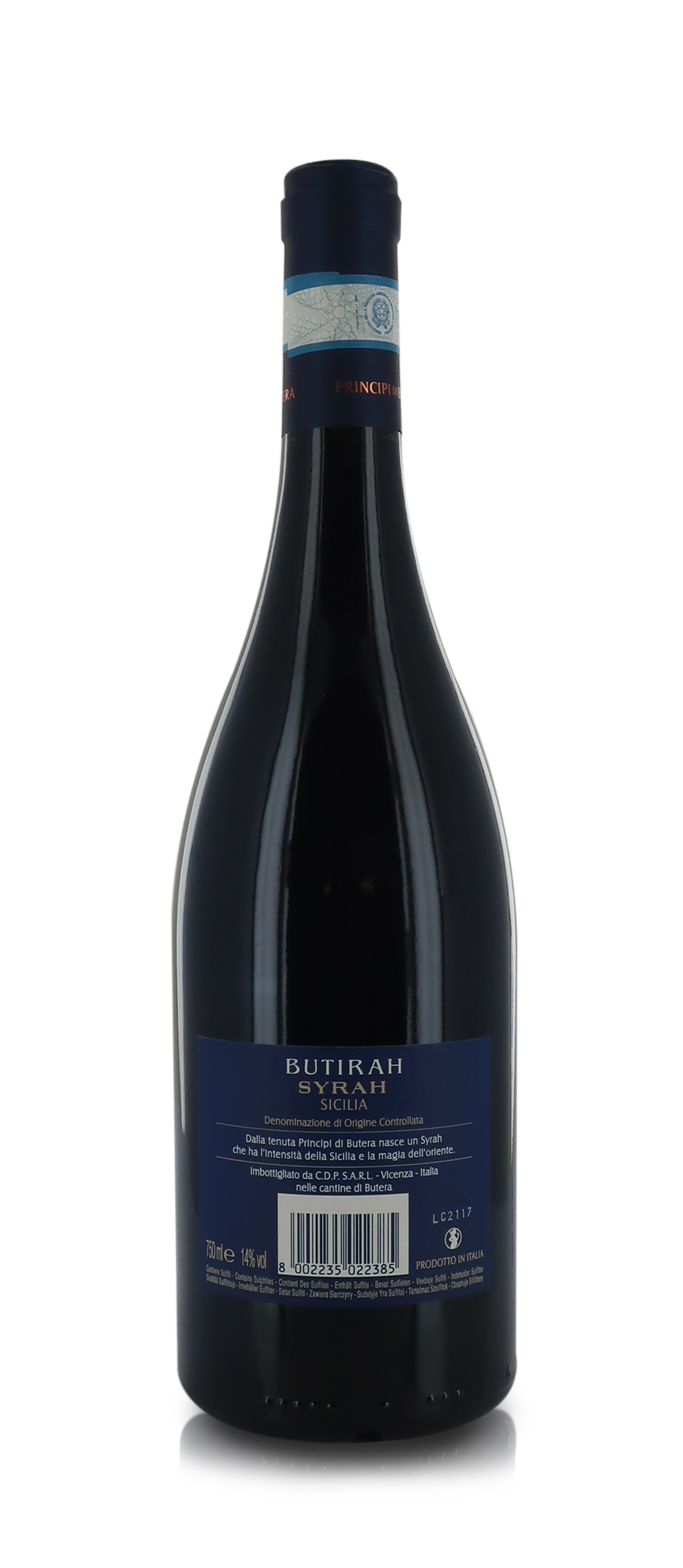 6 bottiglie da 750 ml. Butirah è l’antico nome arabo di Butera, che evoca le origini levantine del Syrah e svelare l’anima esotica di una Sicilia a metà strada tra Oriente e Occidente. Il vino Butirah è un rosso intenso e avvolgente, che profuma di marasca, di frutti e spezie dolci. Classificazione: Syrah Sicilia DOC / Zona di produzione: Butera, Sicilia Centro-Sud / Uve: 100% Syrah / Note di Degustazione: - Colore: rosso rubino brillante e molto intenso. / - Profumo: bouquet ampio e persistente con piacevoli note di marasca, frutta e spezie dolci. / - Sapore: ricco, avvolgente e di grande struttura, con nette sensazioni di piacevole fruttuosità, sostenute da un finale lungo e carezzevole al palato. / Abbinamenti: Ideale con paste ripiene saporite, paste condite con sughi piccanti e ragout di lepre, spezzatini e cacciagione in salmì. Ottimo anche con pecorini stagionati o formaggi erborinati.