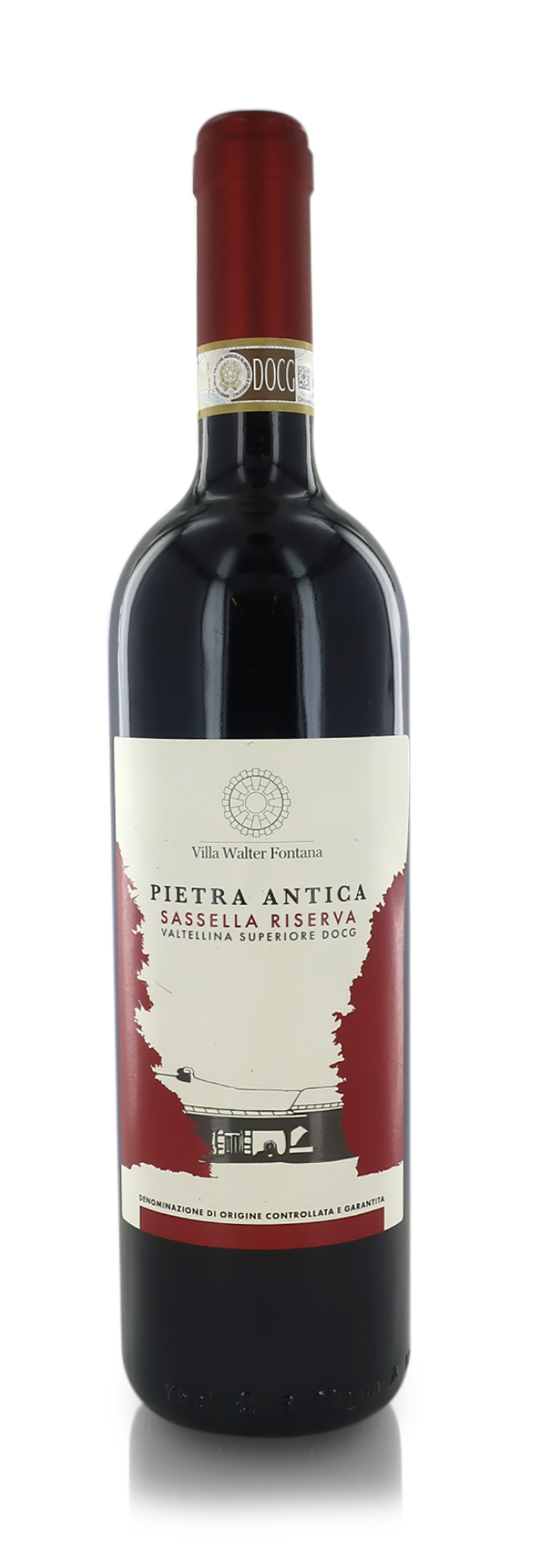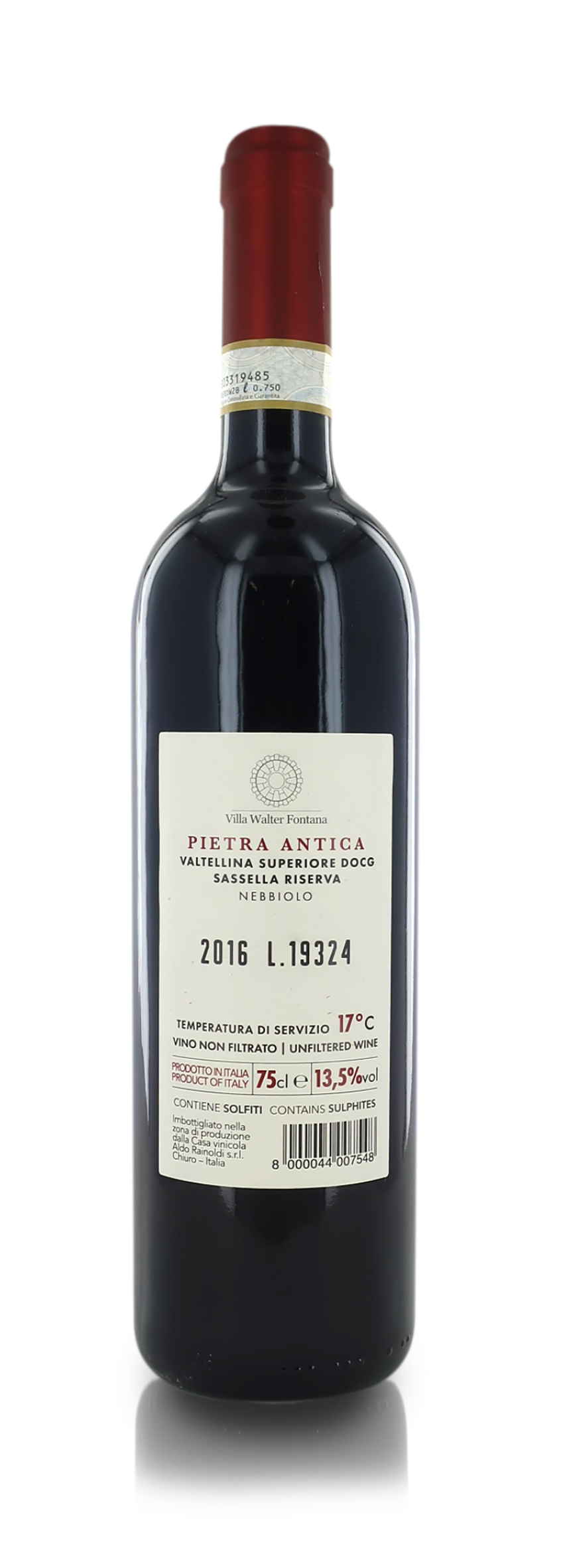 Vino rosso valtellinese "Pietra Antica" del marchio "Villa Walter Fontana". Cartone di 6 bottiglie da 750 ml l'una. Si tratta di un Sassella Riserva Valtellina Superiore DOCG realizzato con varietà d'uva "Nebbiolo" (Chiavennasca). Rientra nel gruppo dei vini rossi fermi. Vanta una gradazione alcolica di 13,5% e un colore rosso rubino intenso. All'olfatto, si percepisce un bouquet complesso di profumi caratterizzato da sentori di fiori rossi e confettura. Al palato, il sapore è pieno, rotondo e armonico.