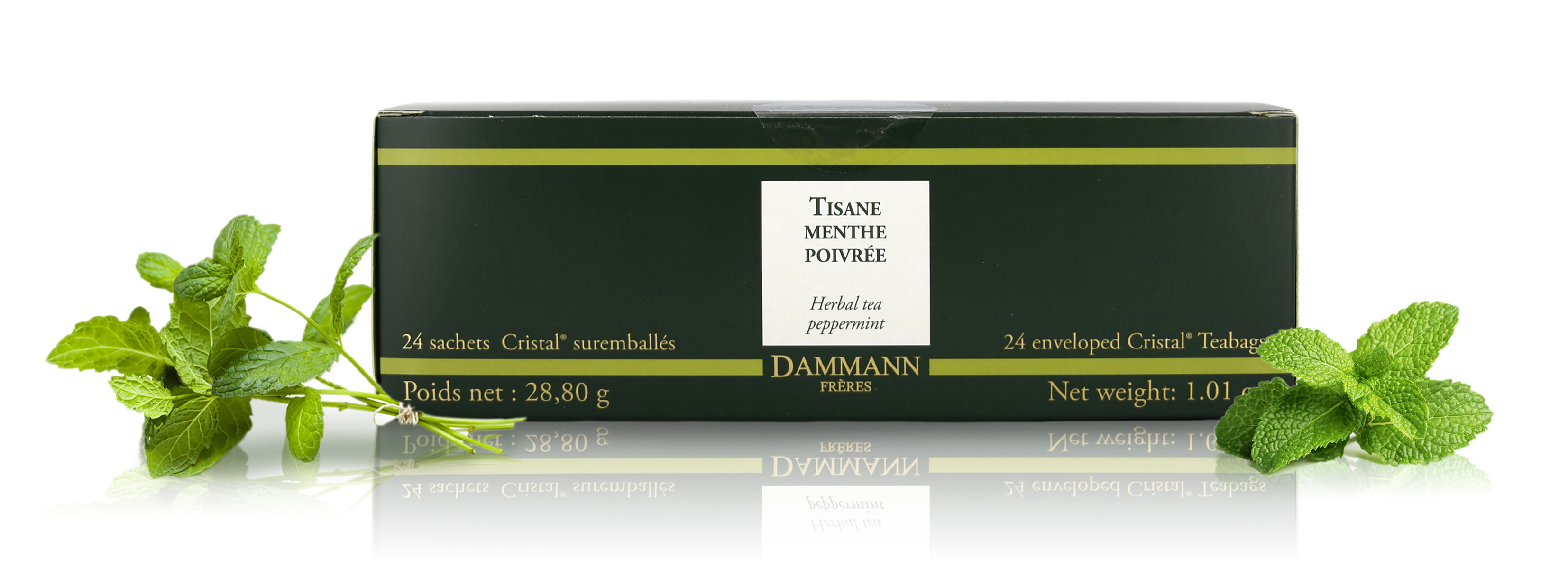 Questa tisana alla menta piperita di Dammann Frères è contenuta in eleganti e pratici filtri Cristal incartati singolarmente.