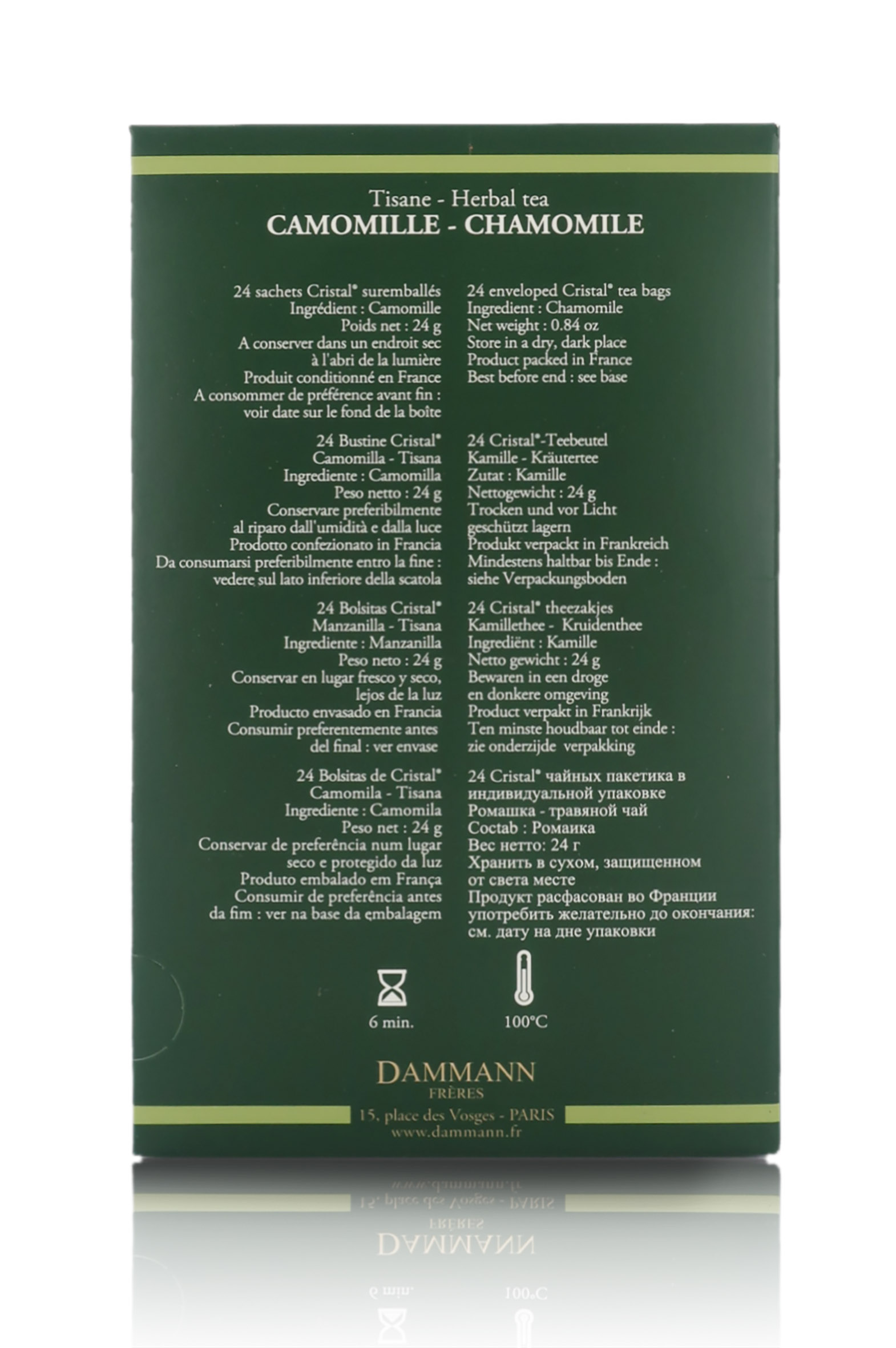La tisana alla camomilla Dammann Frères è contenuta in esclusive e pratiche bustine "Cristal" incartate singolarmente.