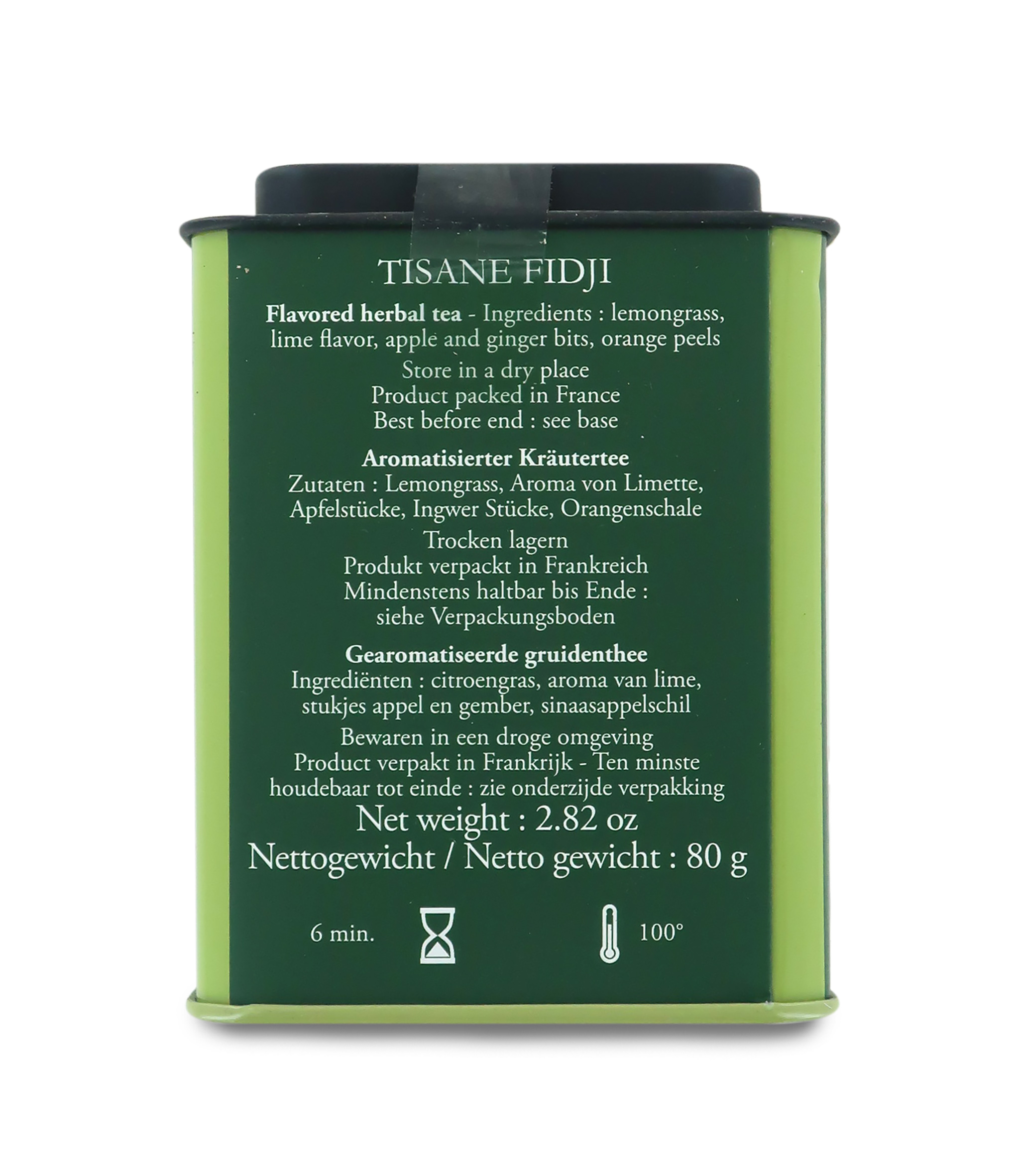 La tisana energizzante "Fidji" al limone, citronella e zenzero di Dammann Frères è contenuta in un'elegantissima scatola di latta, perfetta non solo per conservare il prezioso aroma di questa miscela pregiata, ma anche da regalare.
