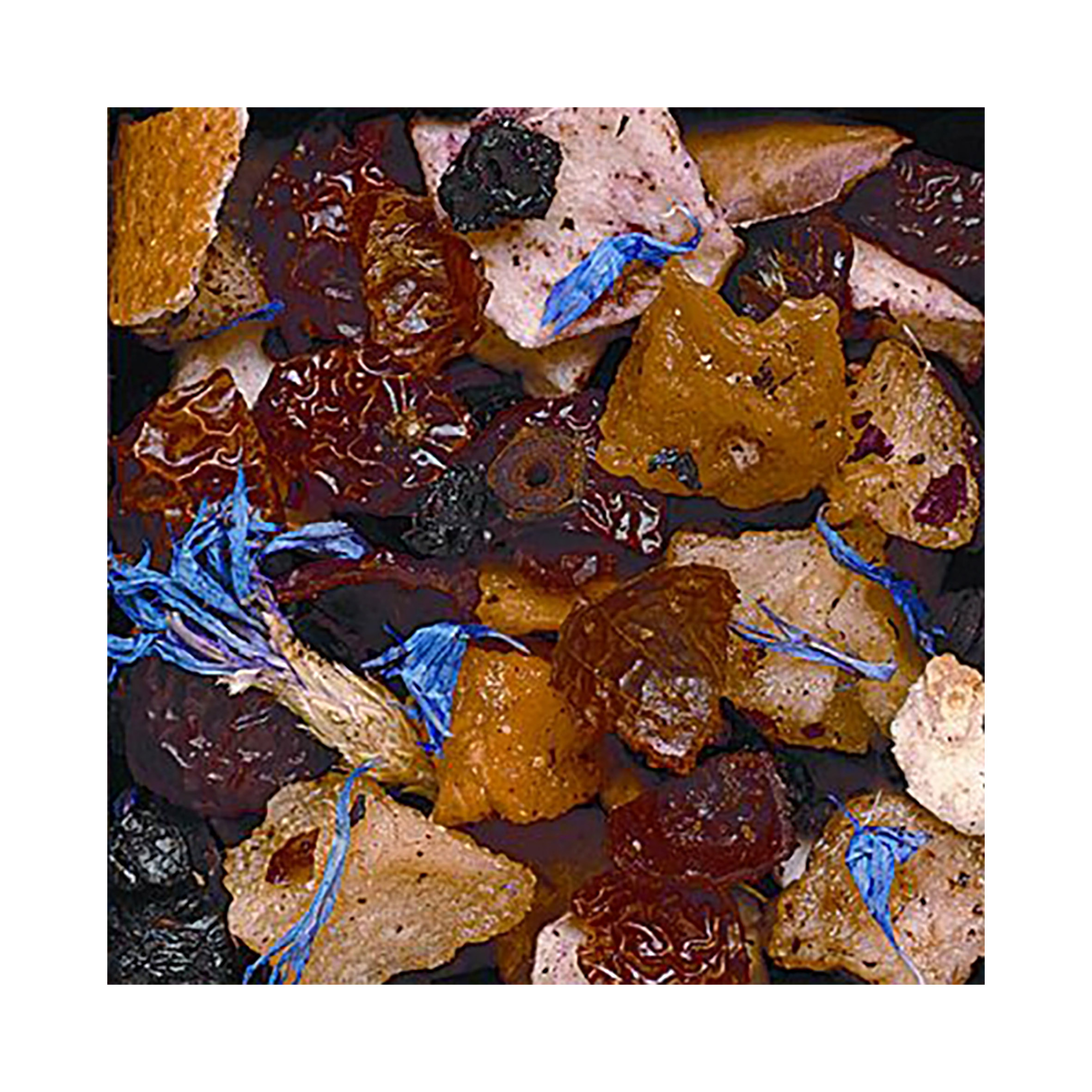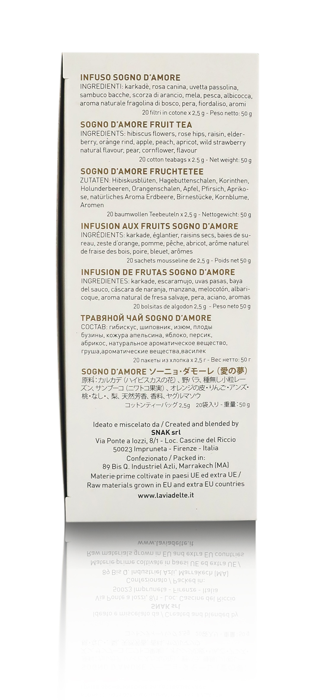 Ingredienti: carcadè, rosa canina, uvetta passolina, sambuco in bacche, scorza di arancio, mela, pesca, albicocca, aroma naturale fragolina di bosco, pera, fiordaliso, aromi.