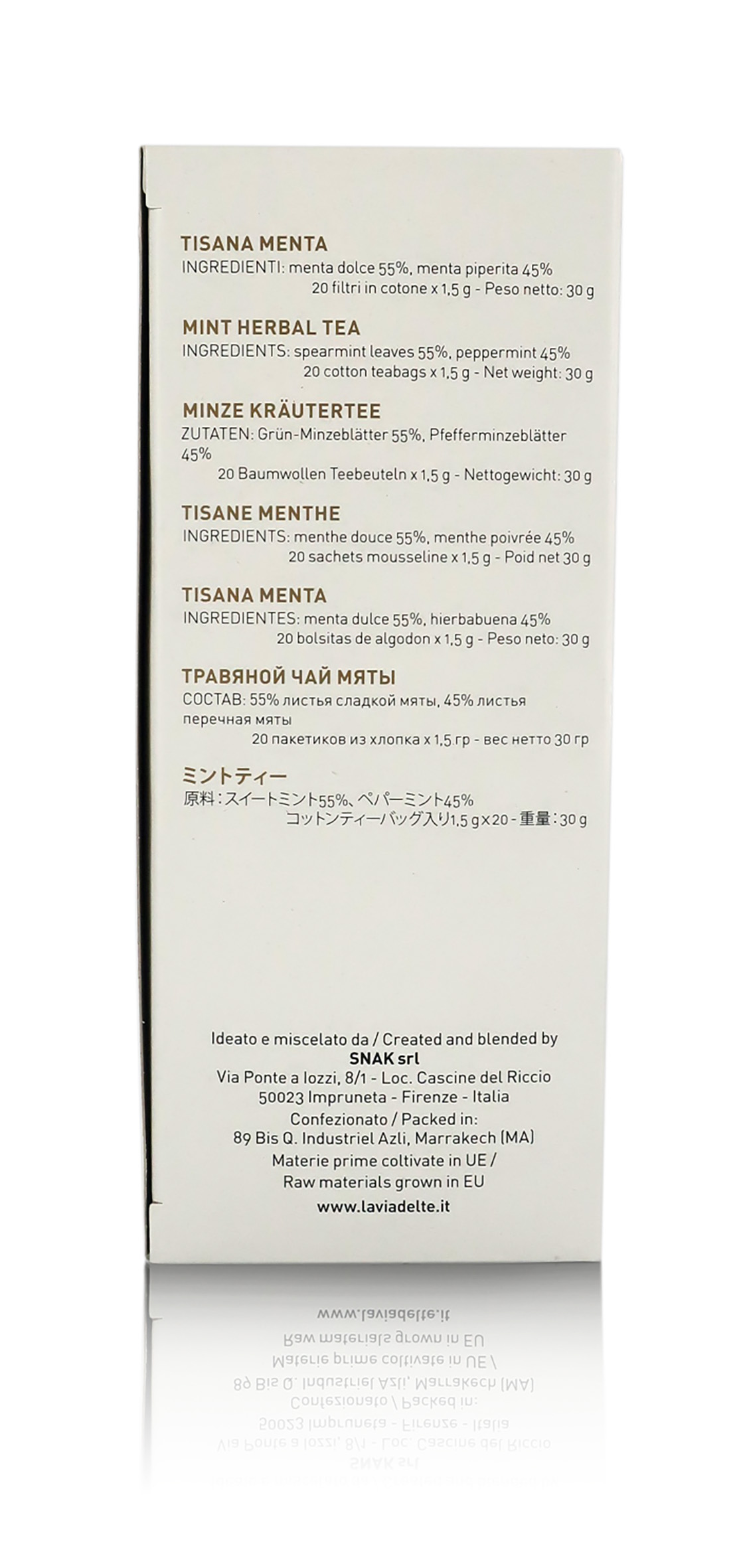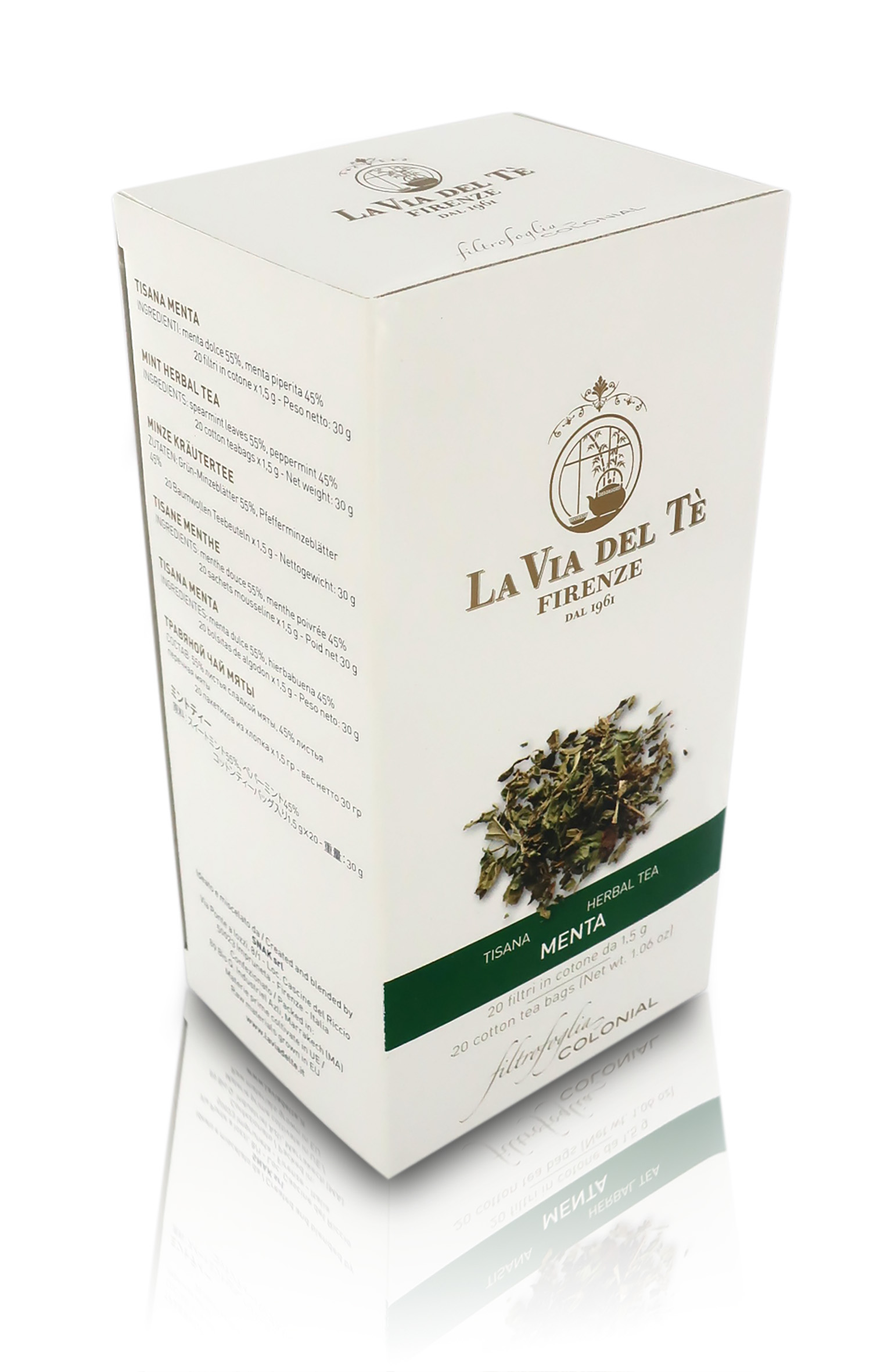 Miscela per la preparazione di tisana alla menta, realizzata con menta piperita e menta dolce. La menta piperita è conosciuta fino dall'antichità per le sue proprietà aromatiche, antispasmodiche, digestive e antisettiche. Le sue foglie sono impiegate per aggiungere aroma a tè, infusi e preparazioni gastronomiche. La tisana alla menta vanta un colore giallo chiaro, un aroma penetrante e un sapore dolciastro. In astuccio da 20 filtri.