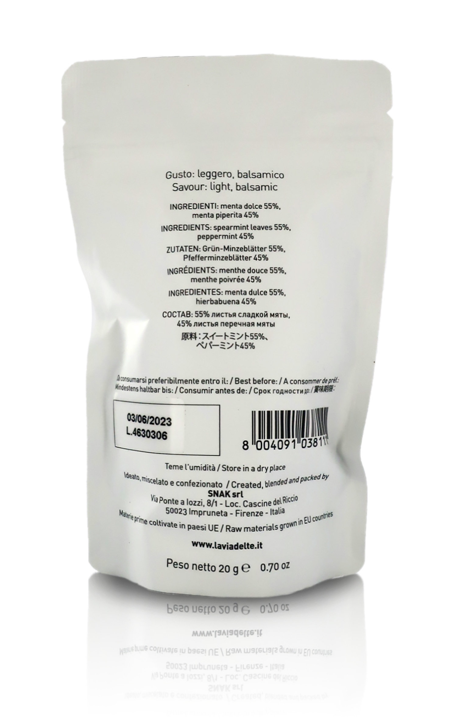 Miscela sfusa per la preparazione di tisana alla menta, realizzata con menta piperita e menta dolce. La menta piperita è conosciuta fino dall'antichità per le sue proprietà aromatiche, antispasmodiche, digestive e antisettiche. Le sue foglie sono impiegate per aggiungere aroma a tè, infusi e preparazioni gastronomiche. La tisana alla menta vanta un colore giallo chiaro, un aroma penetrante e un sapore dolciastro.