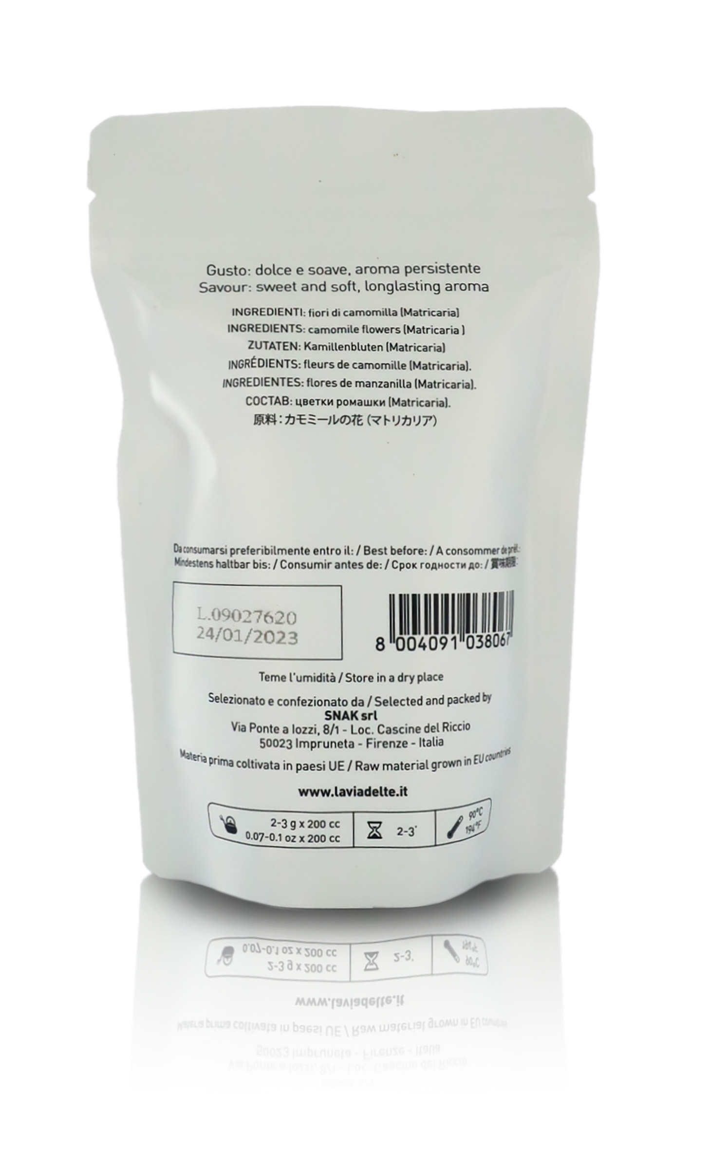 Miscela per camomilla sfusa, realizzata con capolini interi di Camomilla Matricaria. Questo particolare tipo di fiore è noto fin dai tempi antichi grazie alle sue proprietà lenitive. La bevanda che regala spicca per la colorazione gialla intensa, l'aroma dolce e il sapore floreale.