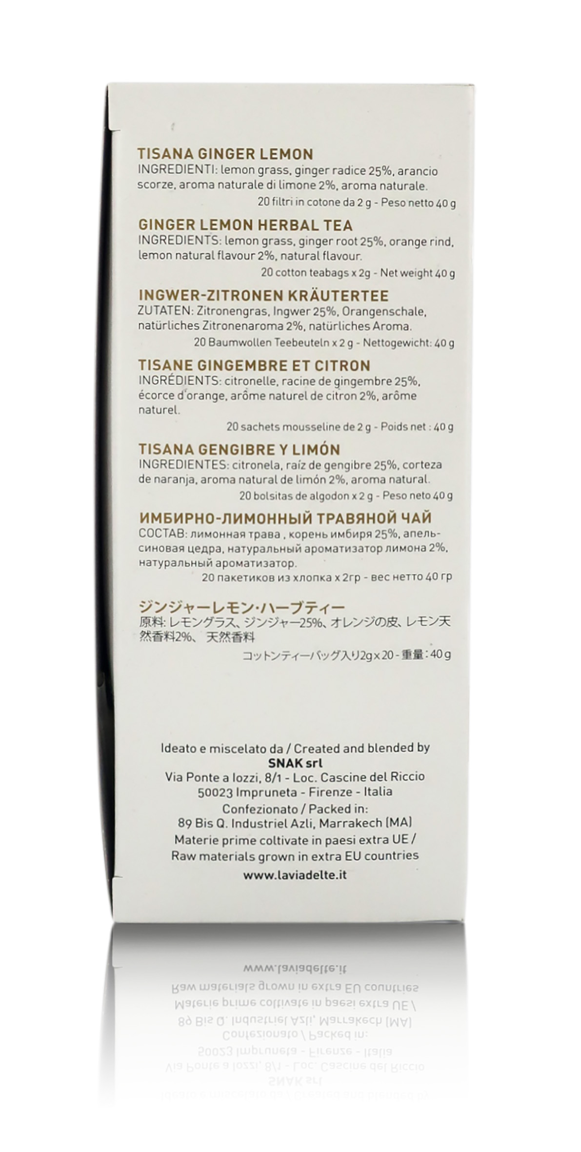 Ingredienti: Lemon grass, zenzero in radice 25%, scorza di arancio, aroma naturale di limone 2%, aroma naturale di zenzero 1%.