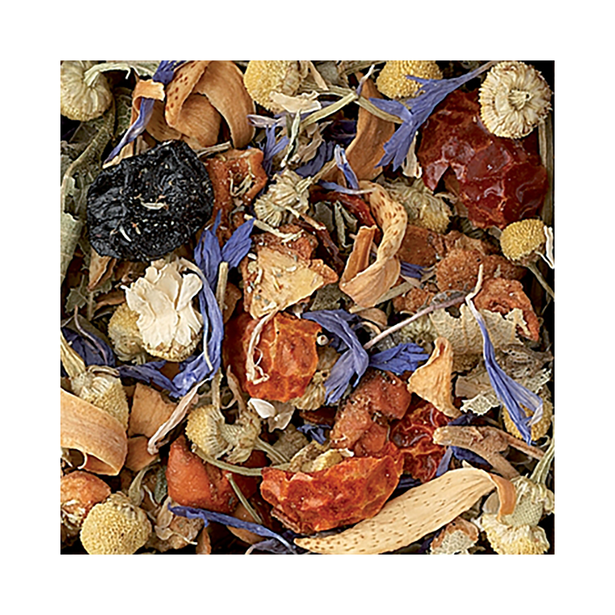 Ingredienti: Mela, camomilla, rosa canina, verbena, ribes nero, arancio fiori, tiglio (foglie e brattee), aromi naturali, fiordaliso.