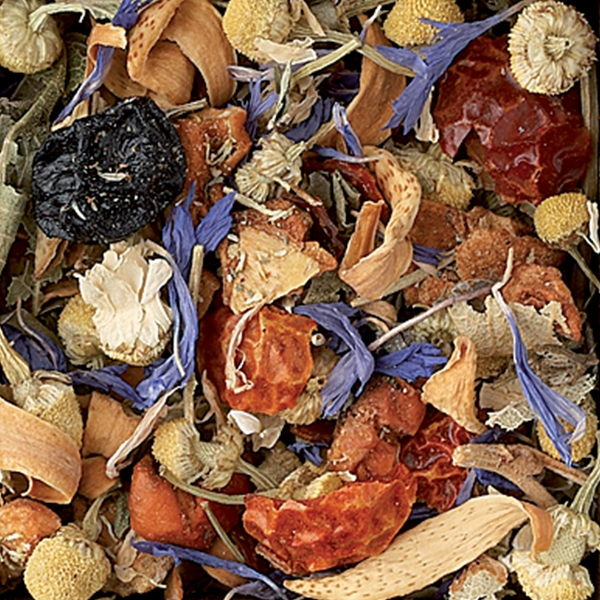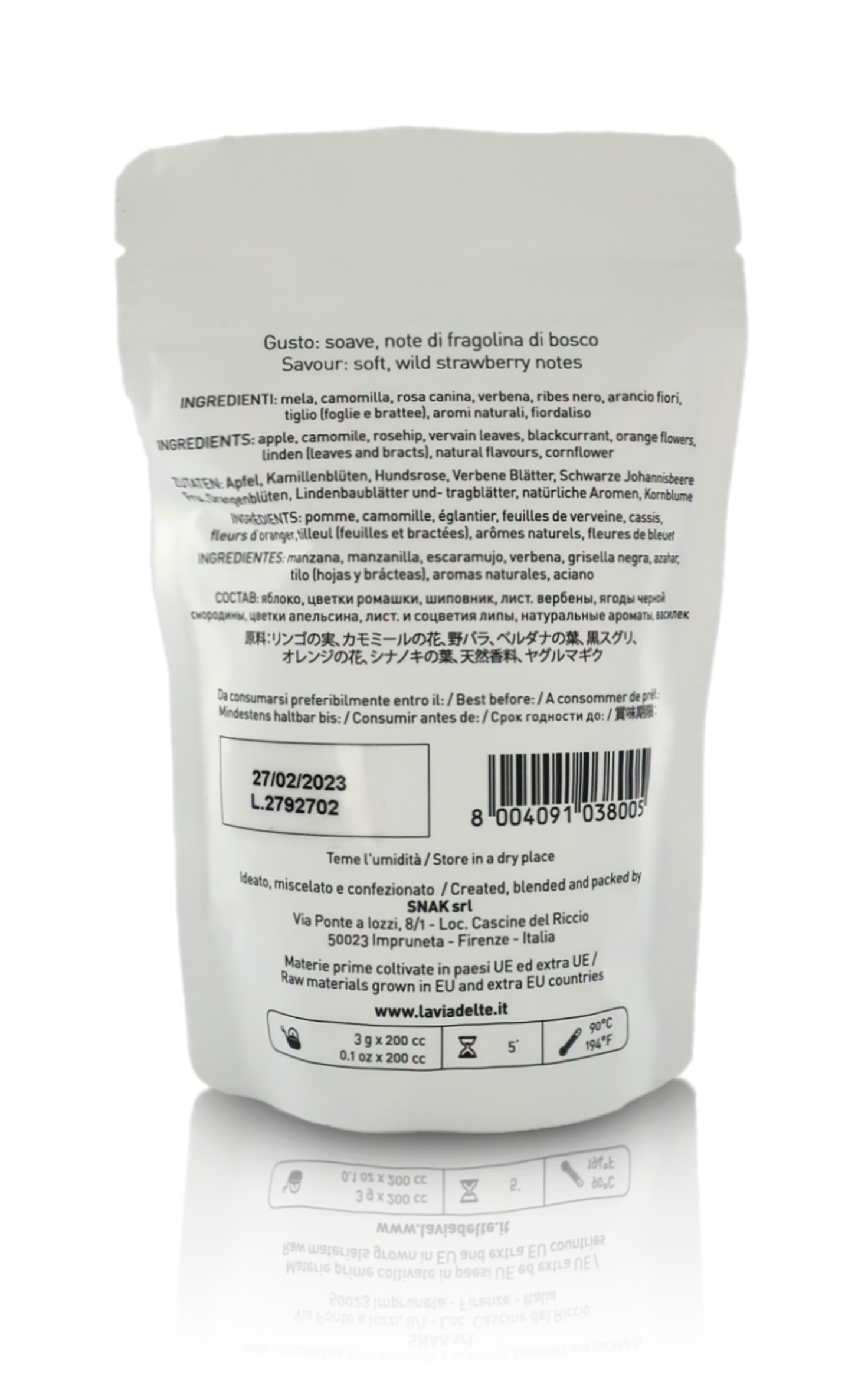 Ingredienti: Mela, camomilla, rosa canina, verbena, ribes nero, arancio fiori, tiglio (foglie e brattee), aromi naturali, fiordaliso.
