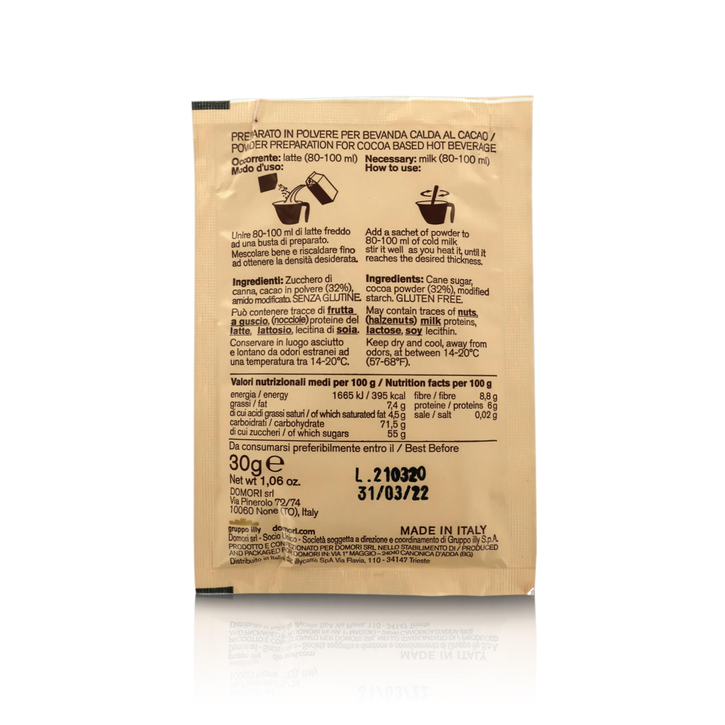 Preparazione: Per preparare un'ottima tazza di cioccolata calda Domori, unisci 100 ml di latte freddo al contenuto di una bustina. Riscalda sul fuoco mescolando fino al raggiungimento della densità desiderata. Servire in tazza guarnendo a piacere con panna!