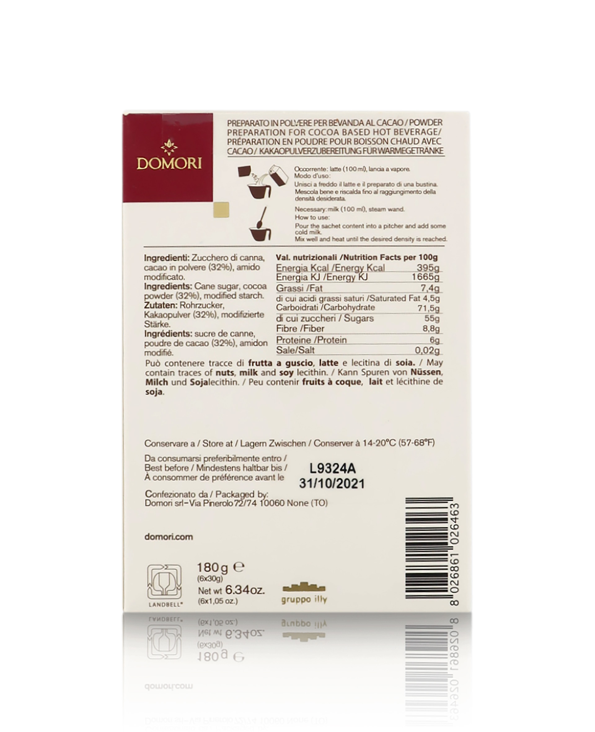 Preparazione: Per preparare un'ottima tazza di cioccolata calda Domori, unisci 100 ml di latte freddo al contenuto di una bustina. Riscalda sul fuoco mescolando fino al raggiungimento della densità desiderata. Servire in tazza guarnendo a piacere con panna!