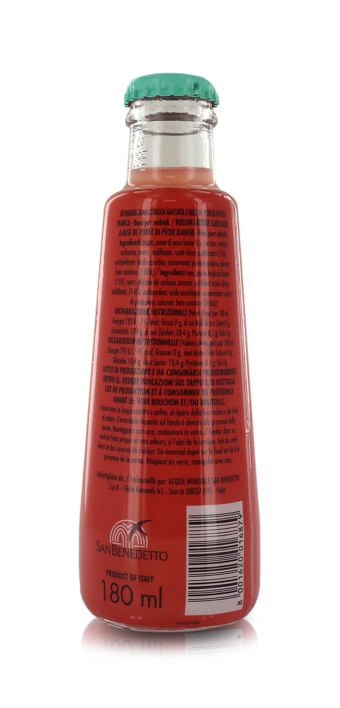 A base di purea di pesca bianca e acqua frizzante: la versione analcolica del celebre cocktail. Una bevanda versatile e buona per tutti. Miscelato con vino spumante è IL BELLINI, con Gin Vodka o Rum bianco diventa un gustoso cocktail alla frutta, ideale in ogni stagione.