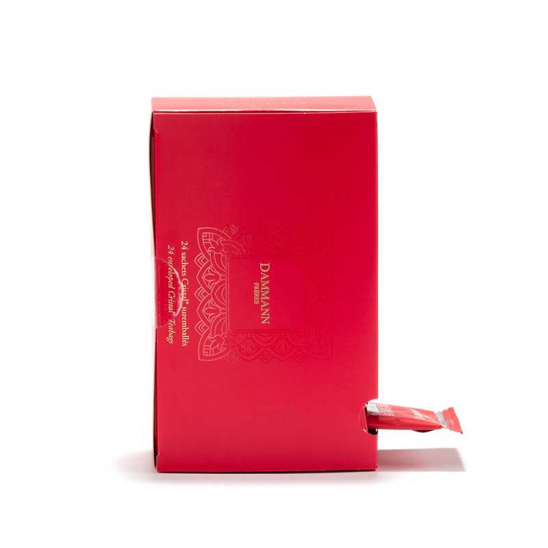 Questo carcadè al profumo di frutta tropicale di Dammann Frères è contenuto in esclusive e pratiche bustine "Cristal" incartate singolarmente.