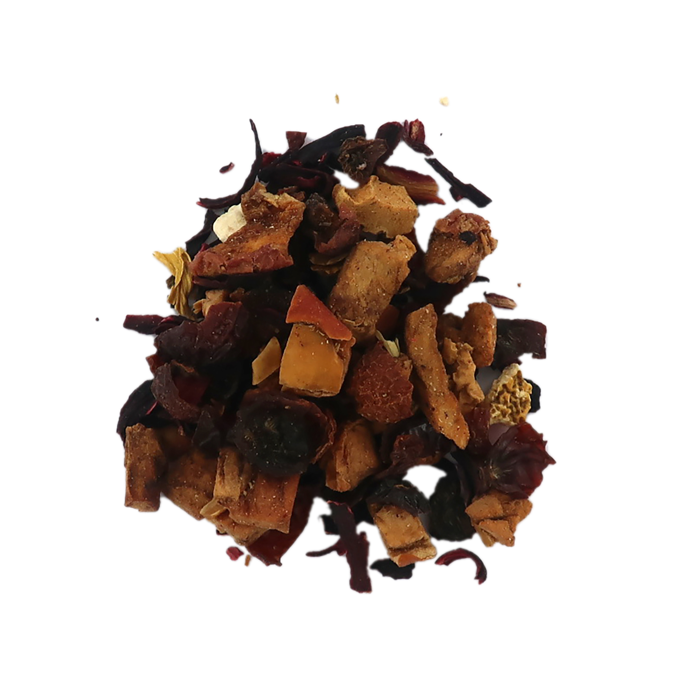 Ingredienti: Pezzi di mela, fiori di ibisco, scorze di rosa canina, scorze di arancia amara, aroma di arancia, petali di fiori.