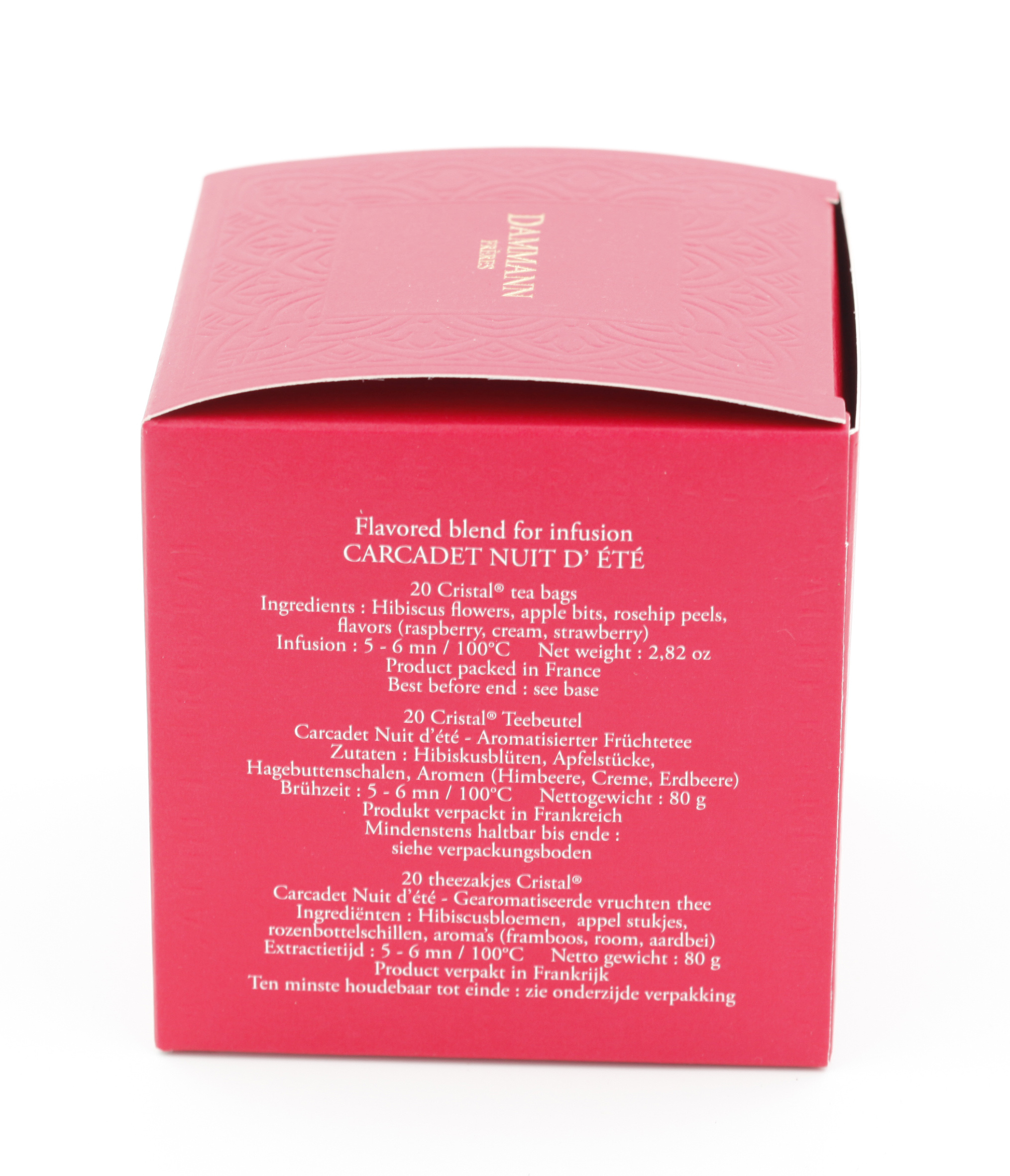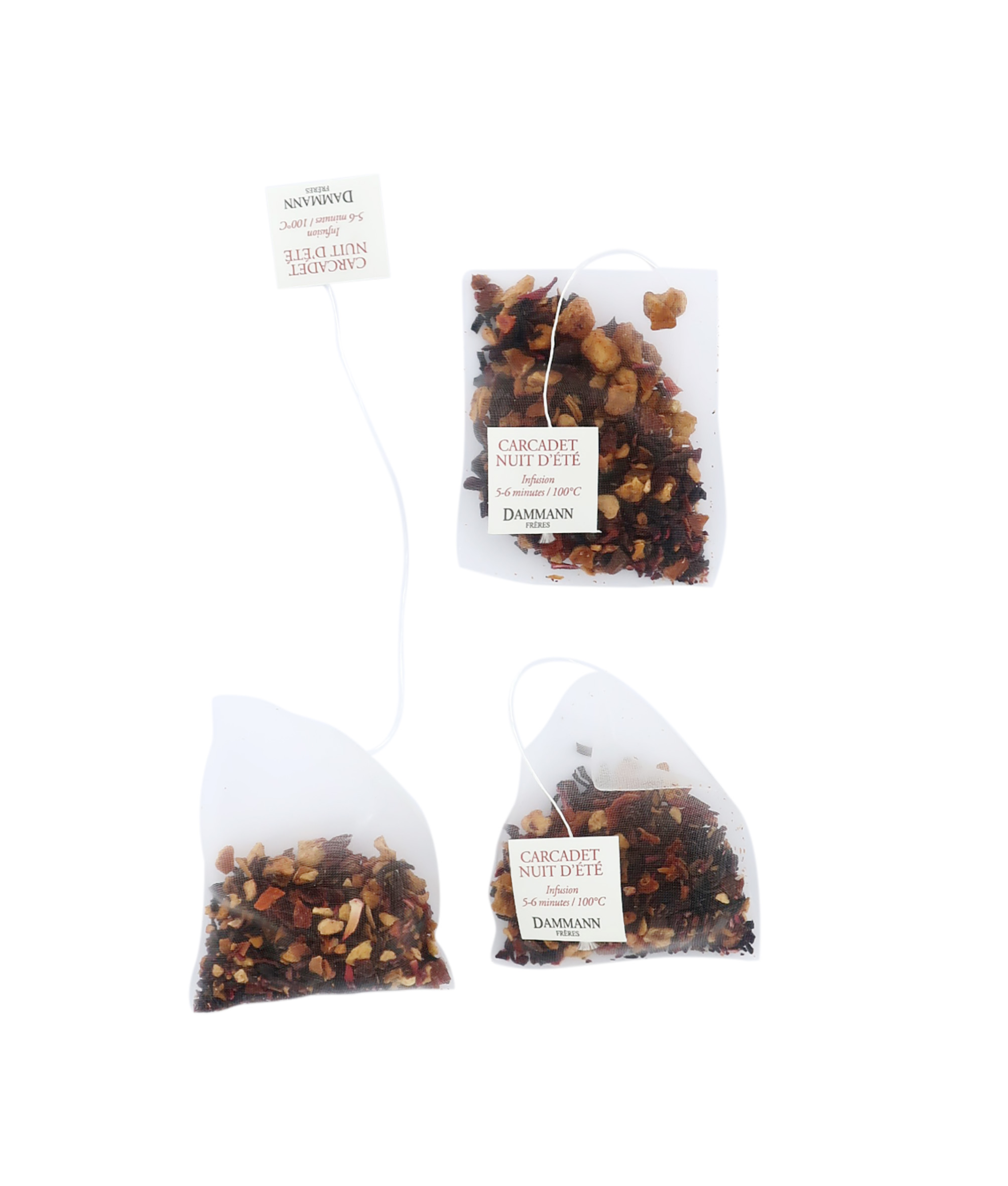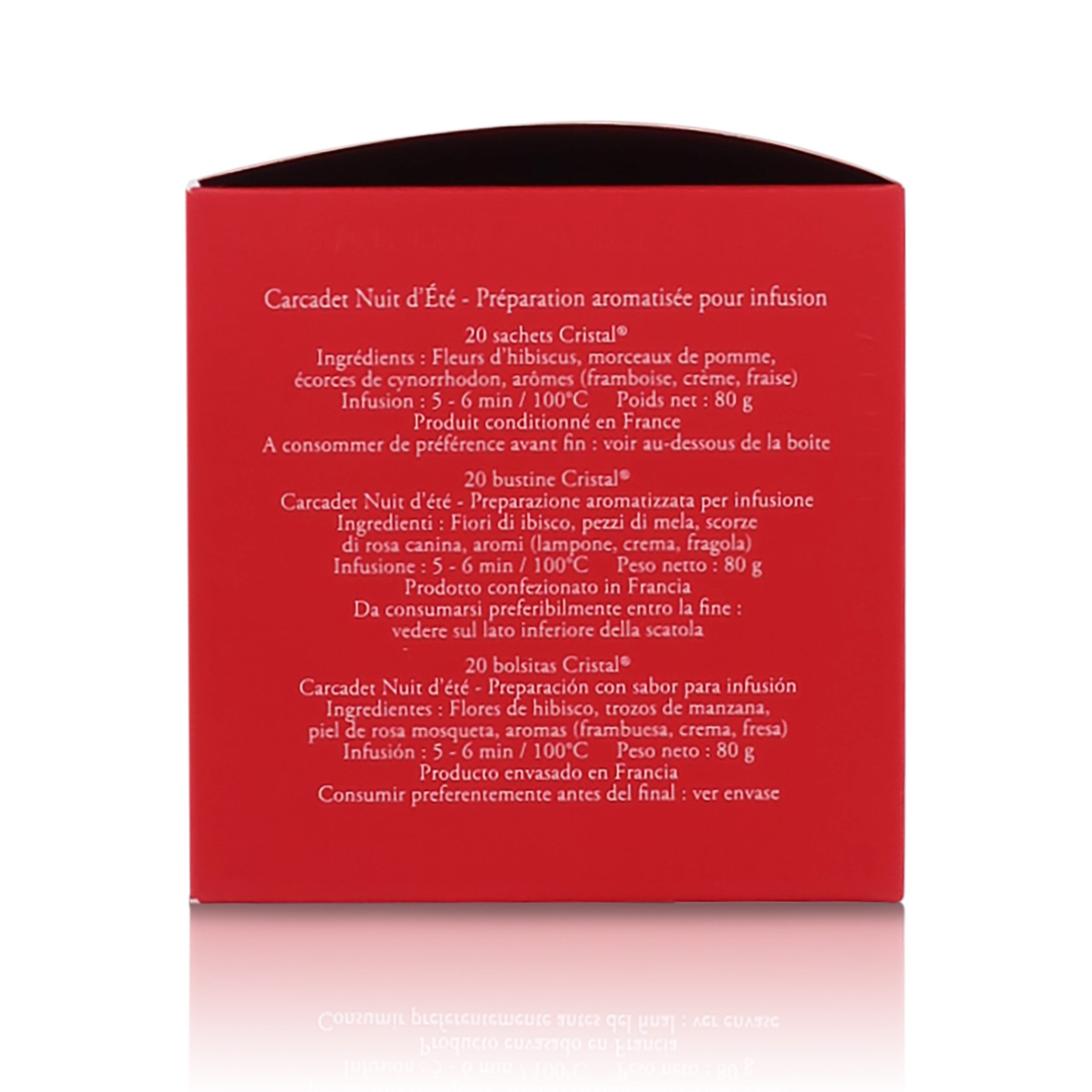 Il carcadè "Carcadet Nuit d'Été", ispirandosi ai profumi di una notte estiva, si compone di una miscela di fiori d'ibisco, pezzi di mela, scorze di rosa canina, aromi di lampone, crema e fragola. Ottimo da bere caldo o anche come tè freddo nelle giornate più calde.