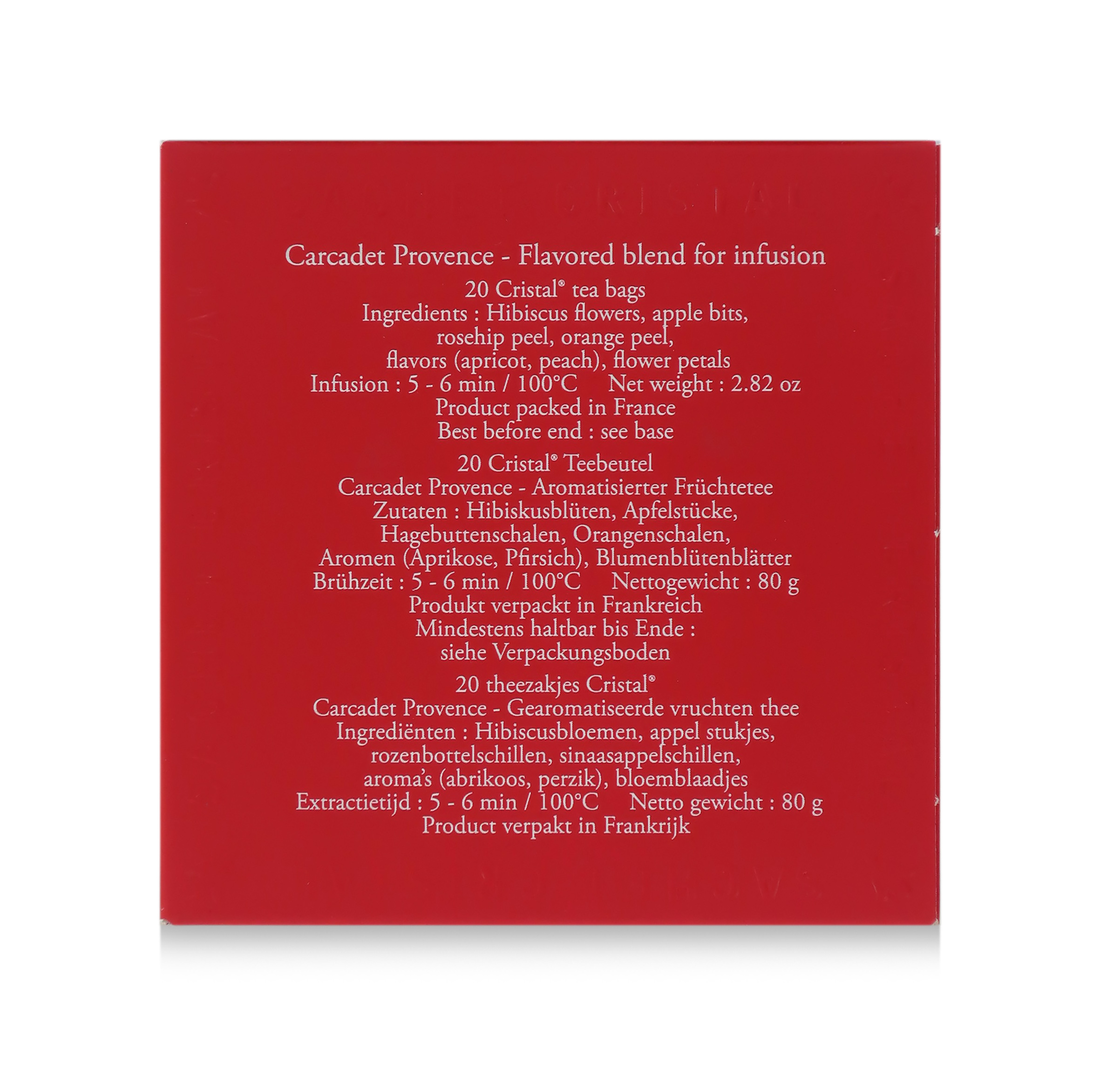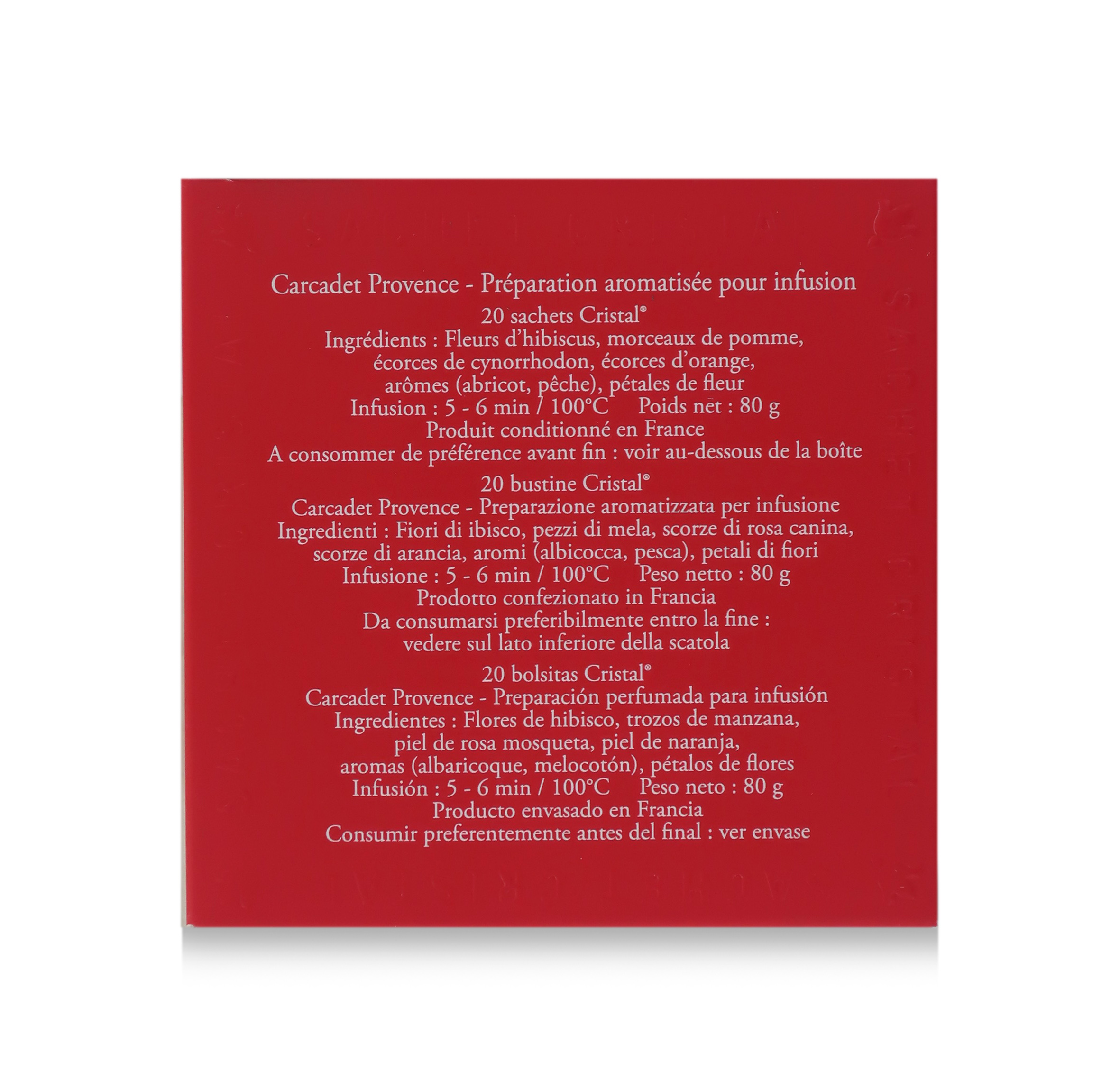 "Carcadet Provence" è una miscela per infuso ai fiori di ibisco, pezzetti di mela, scorze di rosa canina e arancia, arricchito con fiori di elianto. Sorso dopo sorso, si apprezzano anche vivaci note di albicocca e pesca.