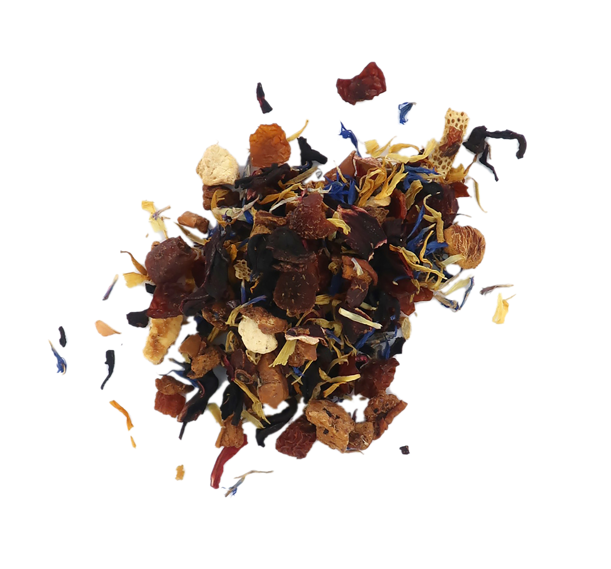 Ingredienti: fiori di ibisco, scorze di rosa canina, pezzi di mela, scorze di arancia, petali di fiori, aromi (mango, frutti tropicali).