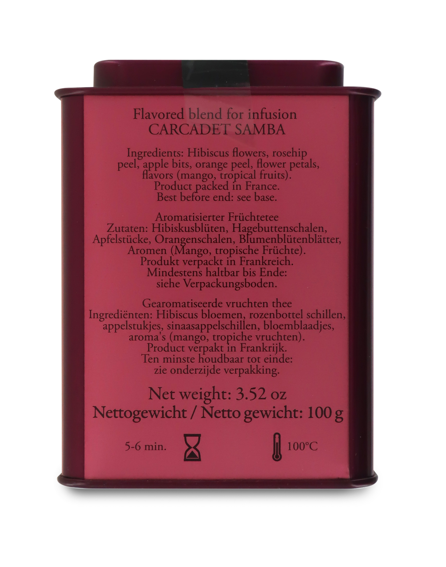 La miscela di tè d'ibisco "Carcadet Samba" racchiude fiori d'ibisco, pezzetti di mela, scorze di rosa canina e arancia, arricchite da dolci note di mango e frutti tropicali.