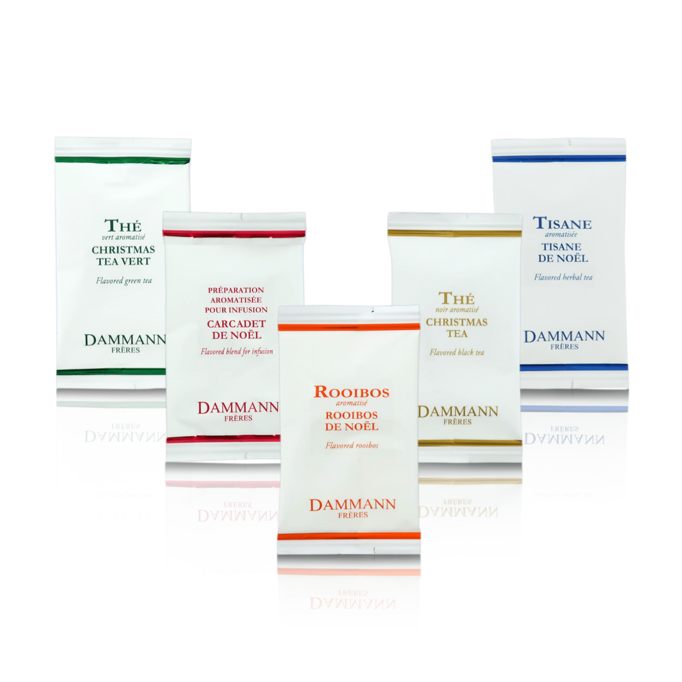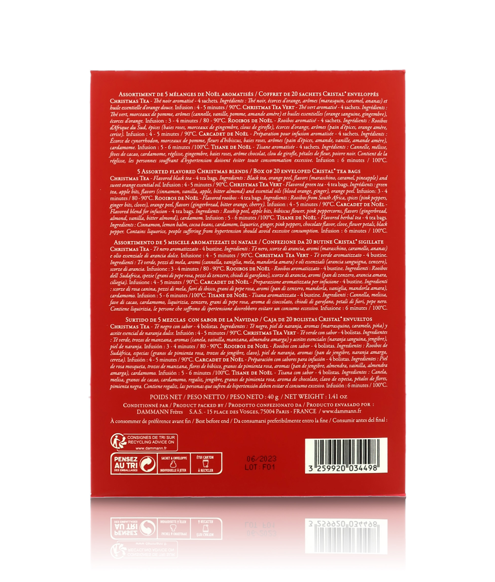 Assortimento di 5 tè natalizi aromatizzati. 4 esclusive bustine Cristal per ogni miscela, per un totale di 20 filtri (peso netto: 40g).