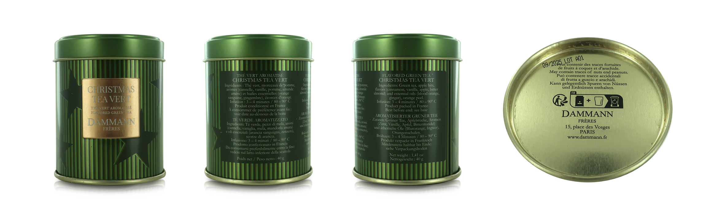 N°223 - CHRISTMAS TEA VERT, tè verde aromatizzato - 40 g - Tè verde, pezzi di mela, aromi (cannella, vaniglia, mela, mandorla amara) e oli essenziali (arancia rossa, zenzero), scorza d'arancia.