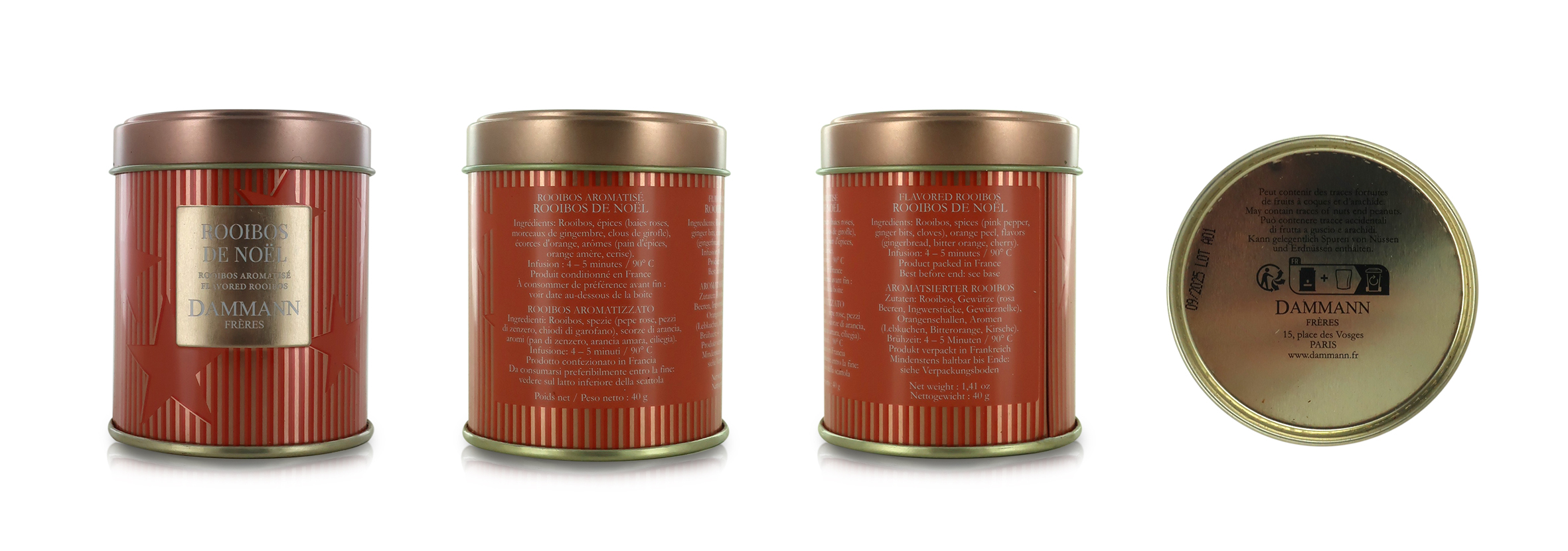 *N°250 - ROOIBOS DE NOËL, rooibos aromatizzato - 40 g: rooibos, spezie (grani di pepe rosa, pezzetti di zenzero, chiodi di garofano), scorza d'arancia, aromi (pan di zenzero, arancia amara, ciliegia).
