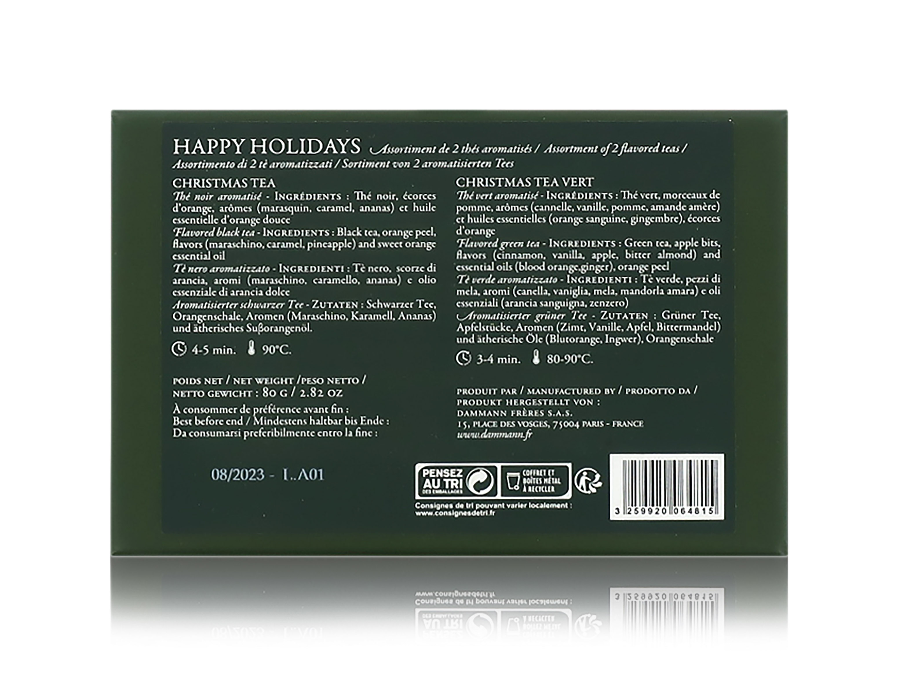 Cofanetto regalo "Happy Holidays" (Buone Vacanze) con un assortimento di 2 pregiati tè natalizi in formato sfuso. Le miscele incluse in questa idea regalo perfetta per gli appassionati del tè d'autore sono aromatizzate con gli inconfondibili profumi del Natale.