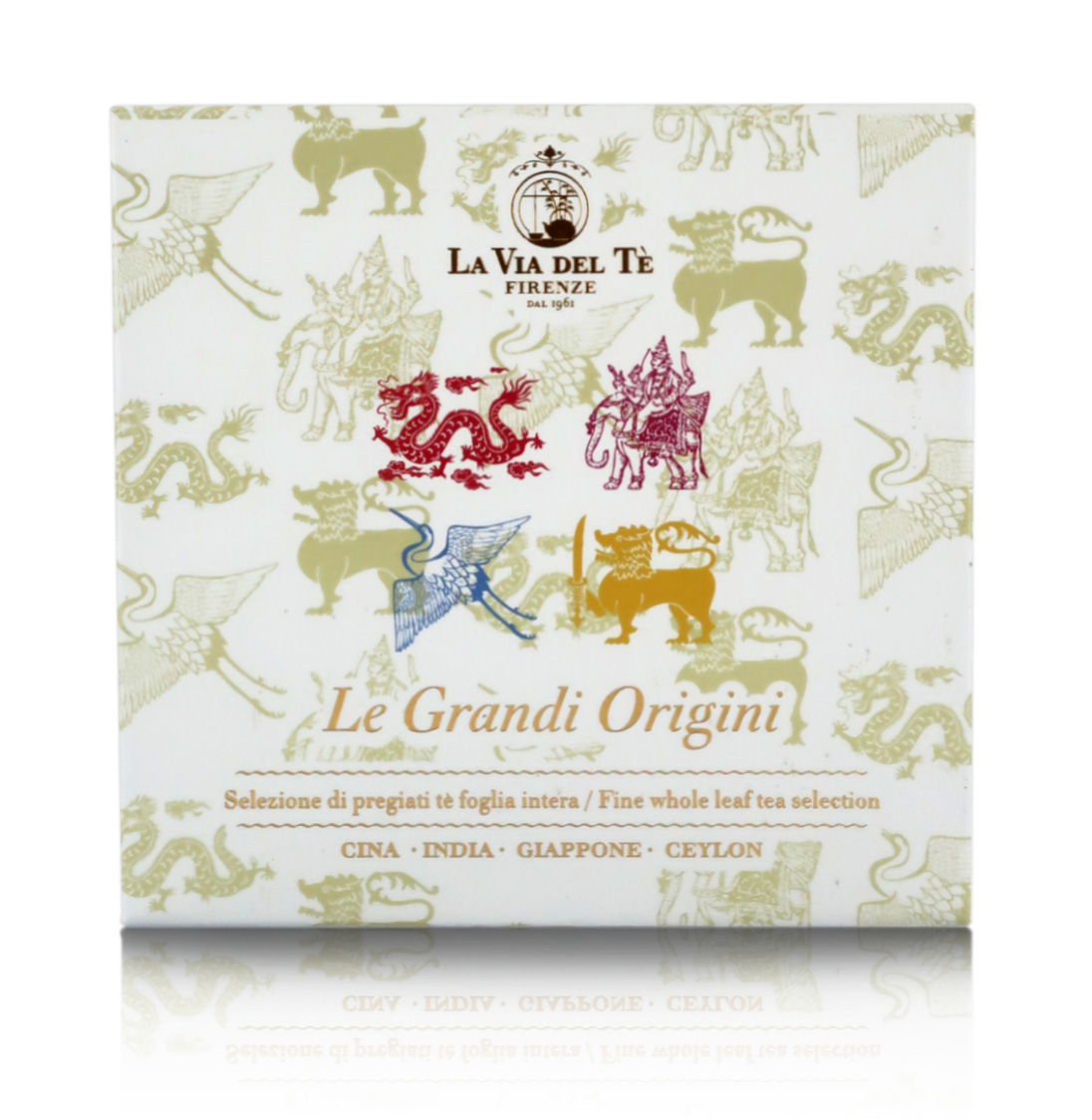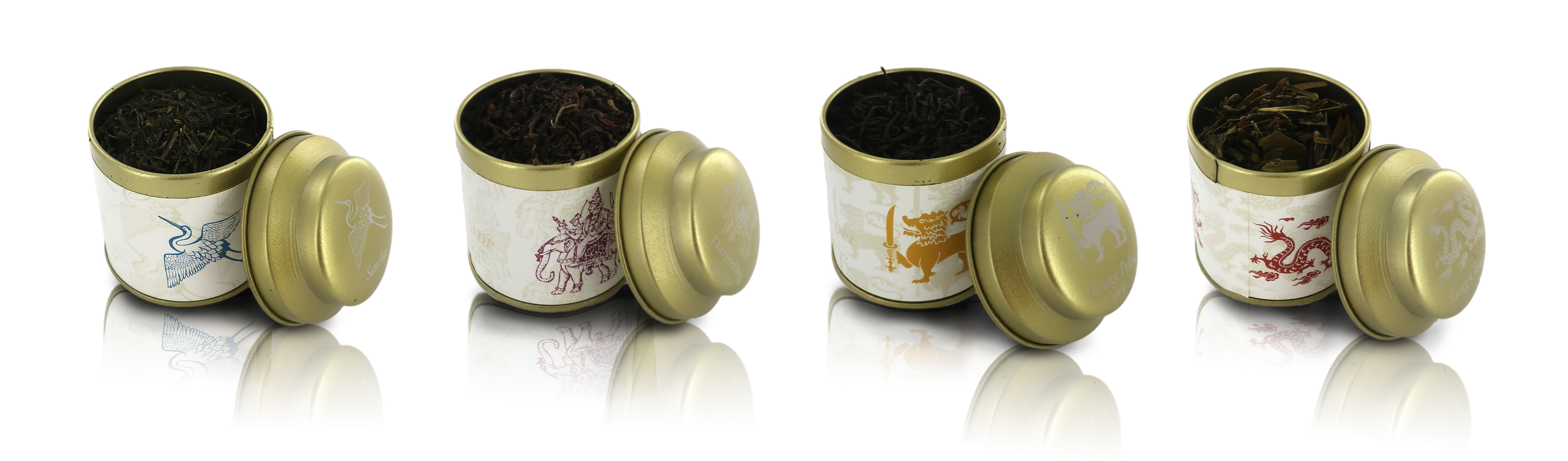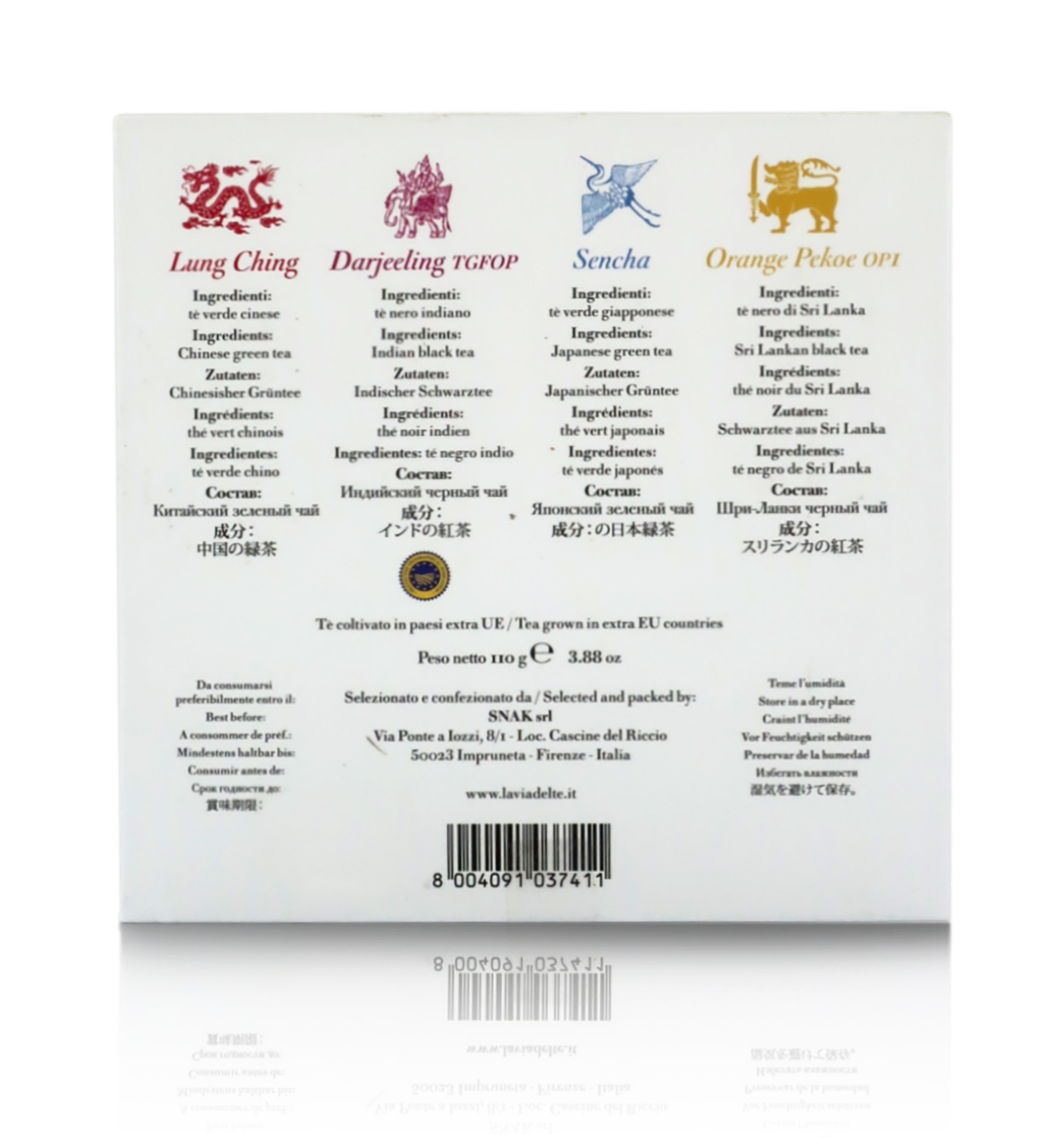 4 graziosi barattolini di latta ospitano altrettante tipologie di tè, diverse per tipologia e provenienza: il tè verde cinese LUNG CHING (uno dei "Dieci Inestimabili Tè" cinesi); il tè nero indiano DARJEELING TGFOP (lo "champagne" dei tè); il tè nero di Ceylon "ORANGE PEKOE OP1" e il tè verde giapponese SENCHA.