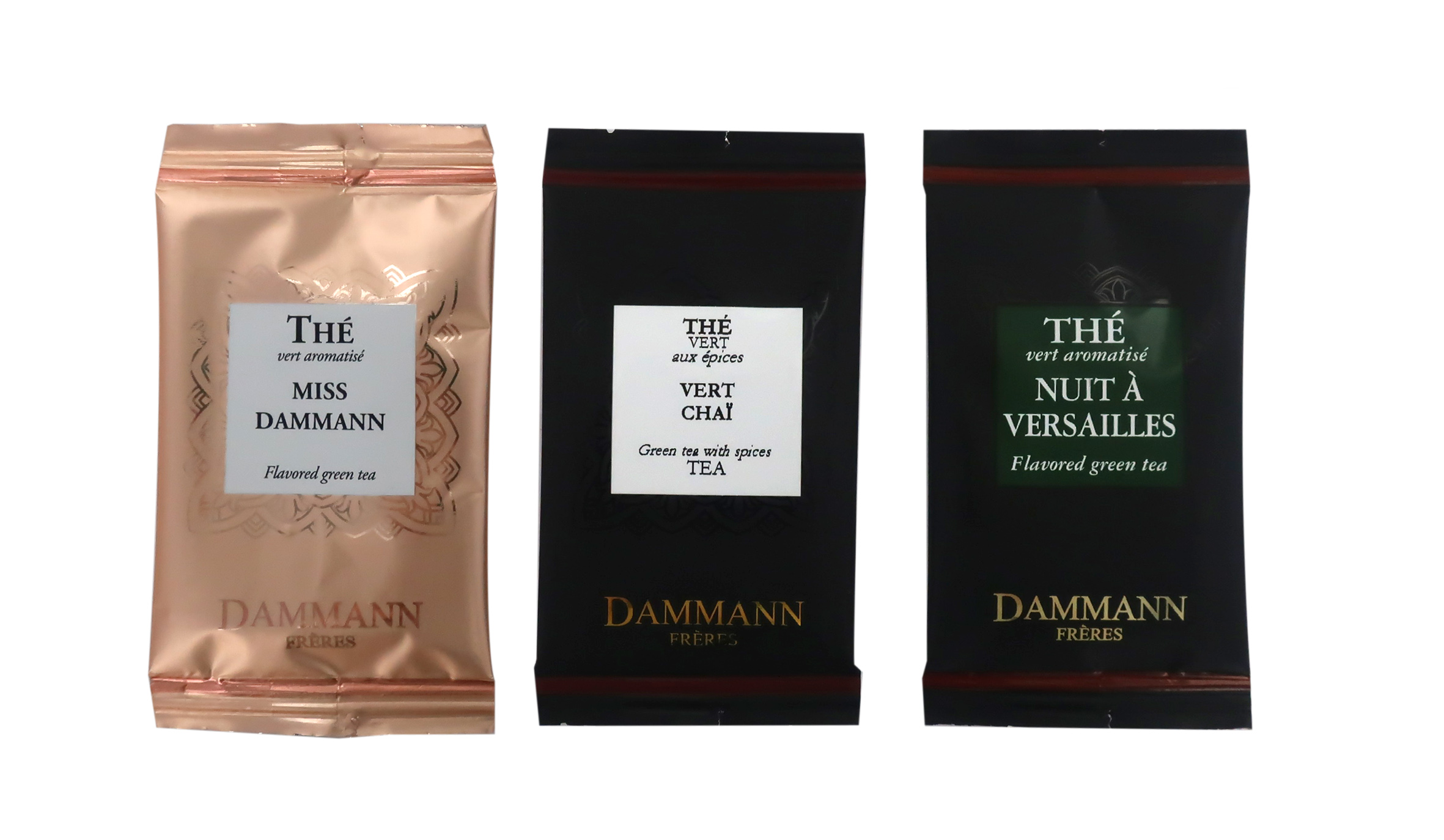 MISS DAMMANN (tè verde aromatizzato - 4 bustine) - Ingredienti : Tè verde, pezzi di zenzero, olio essenziale di limetta e aroma di frutto della passione, petali di fiori. // NUIT À VERSAILLES (tè verde aromatizzato - 4 bustine) - Ingredienti : Tè verde, petali di fiori, aromi (bergamotto, kiwi, fiori d'arancio, viola, pesca). // HAPPY GREEN (tè verde aromatizzato - 4 bustine) - Ingredienti : Tè verde, citronella, aromi (kiwi, cetriolo, mela verde). // TOUAREG (tè verde menta aromatizzato - 4 bustine) - Ingredienti : Tè verde, fogli di menta 24,6%e di menta piperita 4,9%, aroma naturale di menta. // VERT CHAÏ (tè verde con spezie - 4 bustine) - Ingredienti : Tè verde, spezie (zenzero, cannella, grani di pepe rosa, cardamomo, chiodo di garofano).