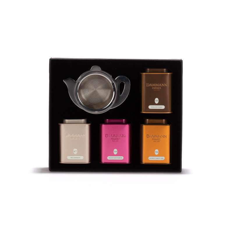 La confezione regalo "Continental" di Dammann Frères include 4 diversi tè aromatizzati. Il cofanetto bicolore nero e rosa risulta molto elegante e raffinato. Al suo interno custodisce 4 carinissimi barattoli di latta (uno per ogni varietà di tè) e un colino da tè aperto in acciaio inossidabile a forma di teiera.