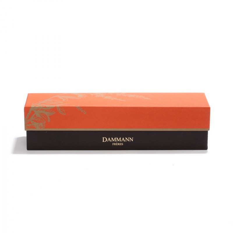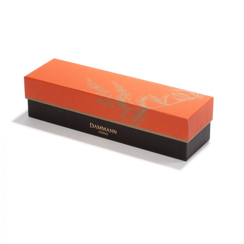 La confezione regalo "Horizons" di Dammann Frères include una collezione di 3 tè aromatizzati e 1 rooibos. Il cofanetto, di forma rettangolare e dal coperchio di un bellissimo arancione acceso, contiene 4 carinissimi barattoli di latta (uno per ogni varietà d'infuso) e un infusore di metallo.