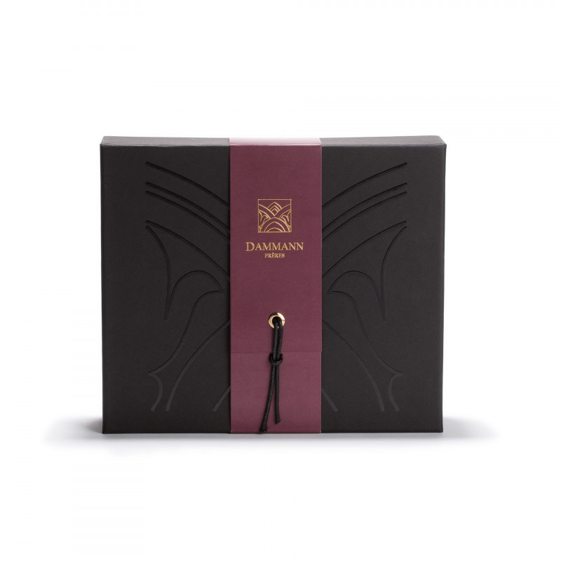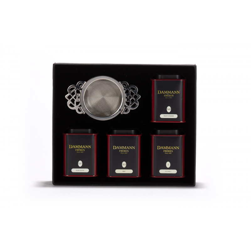 La confezione regalo "Outremer" di Dammann Frères include 4 diversi tè aromatizzati. Il cofanetto bicolore nero e rosso scuro risulta molto elegante e raffinato. Al suo interno custodisce 4 carinissimi barattoli di latta (uno per ogni varietà di tè) e un colino da tè aperto in acciaio inossidabile.