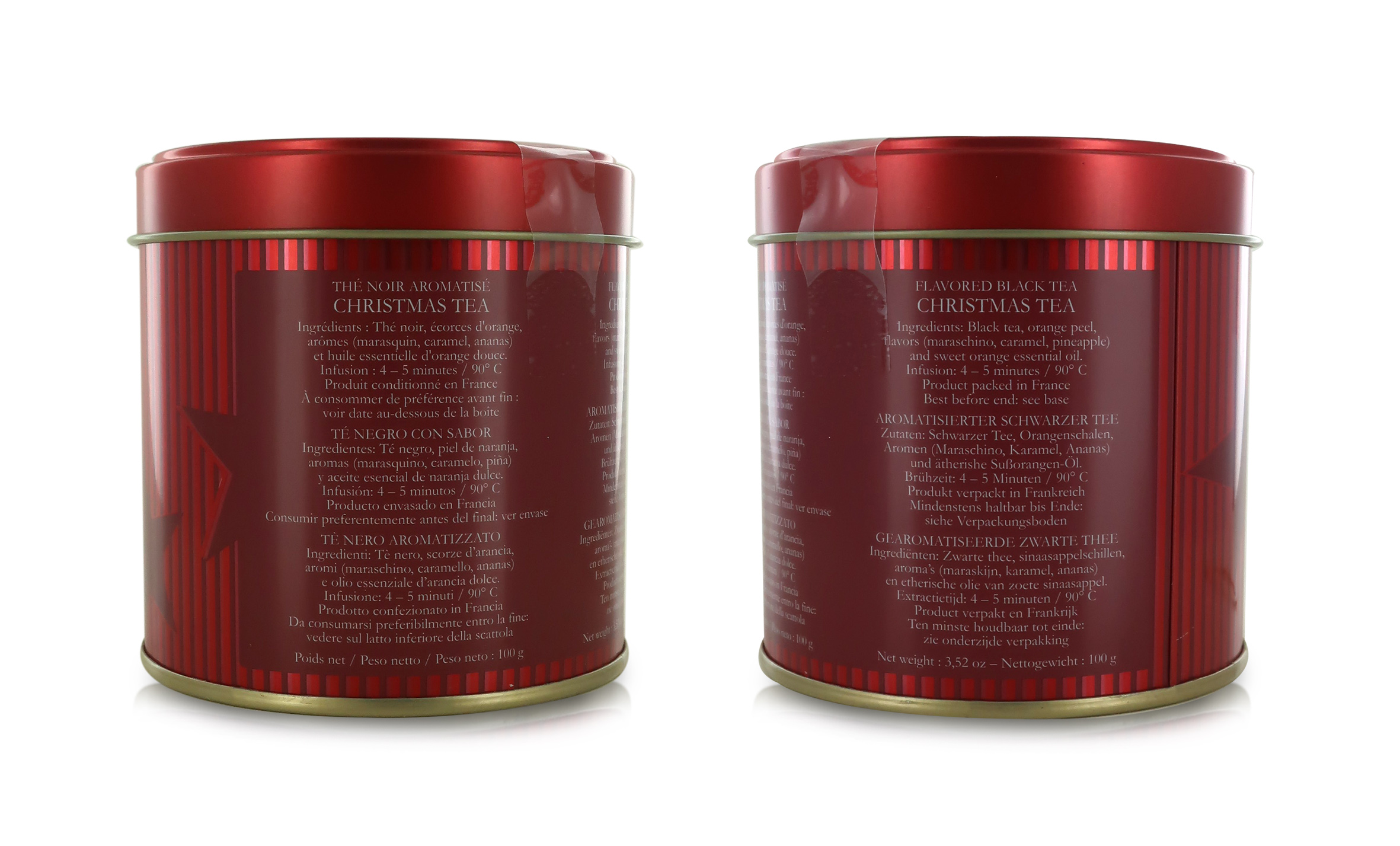 Tè natalizio con scorza d'arancia, aromi (maraschino, caramello, ananas) e olio essenziale di arancia dolce. Un tè nero natalizio molto fruttato, che renderà i vostri pomeriggi delle feste di Natale ancora più speciali! Grazie alla confezione molto natalizia, rappresenta un ottimo regalo per le feste.