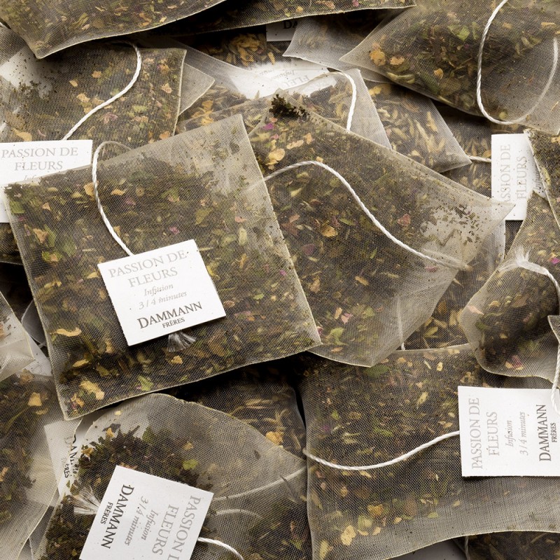 Il tè bianco alla rosa "Passion de Fleurs" di Dammann Frères è contenuto in esclusive e pratiche bustine "Cristal".