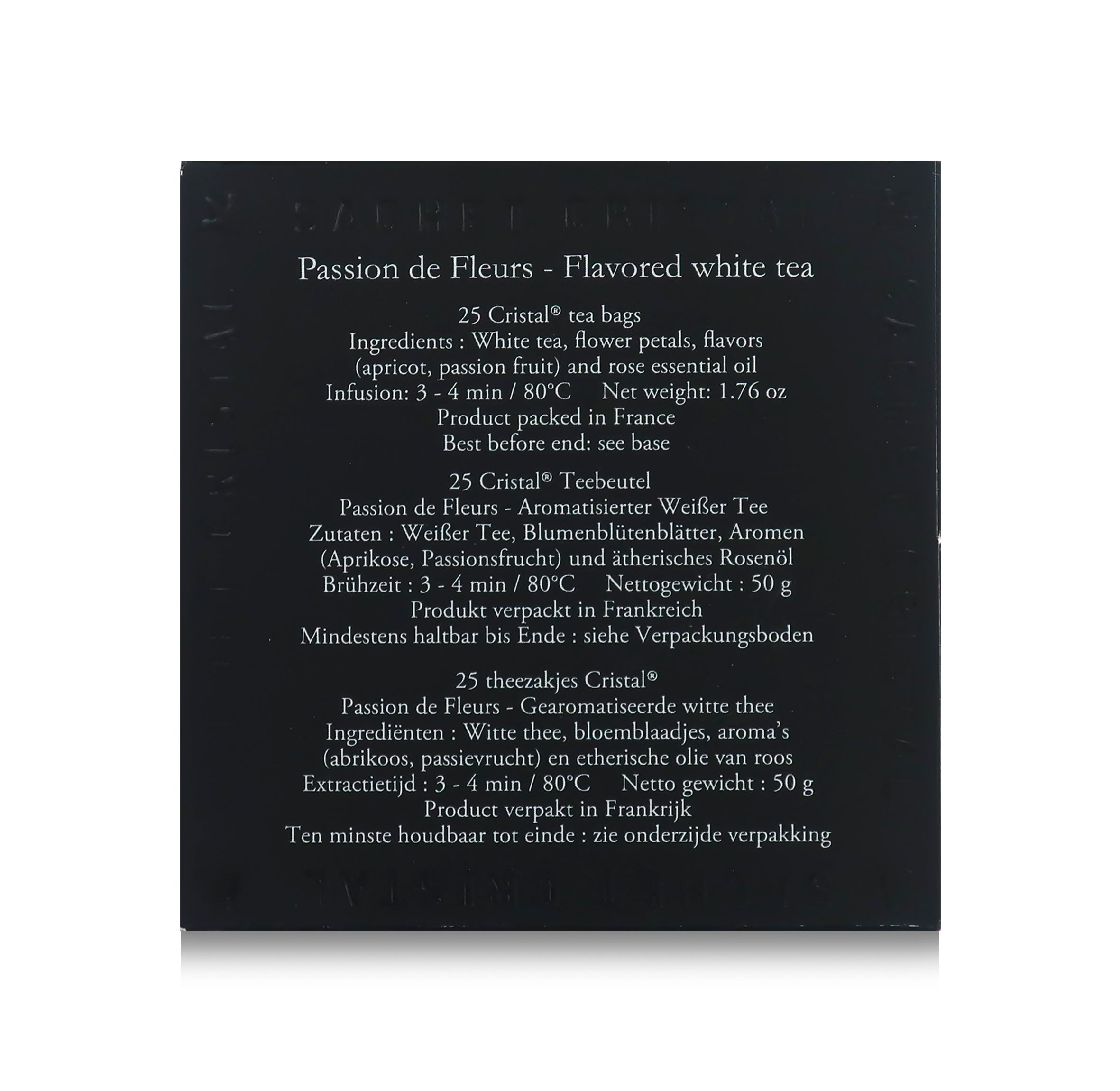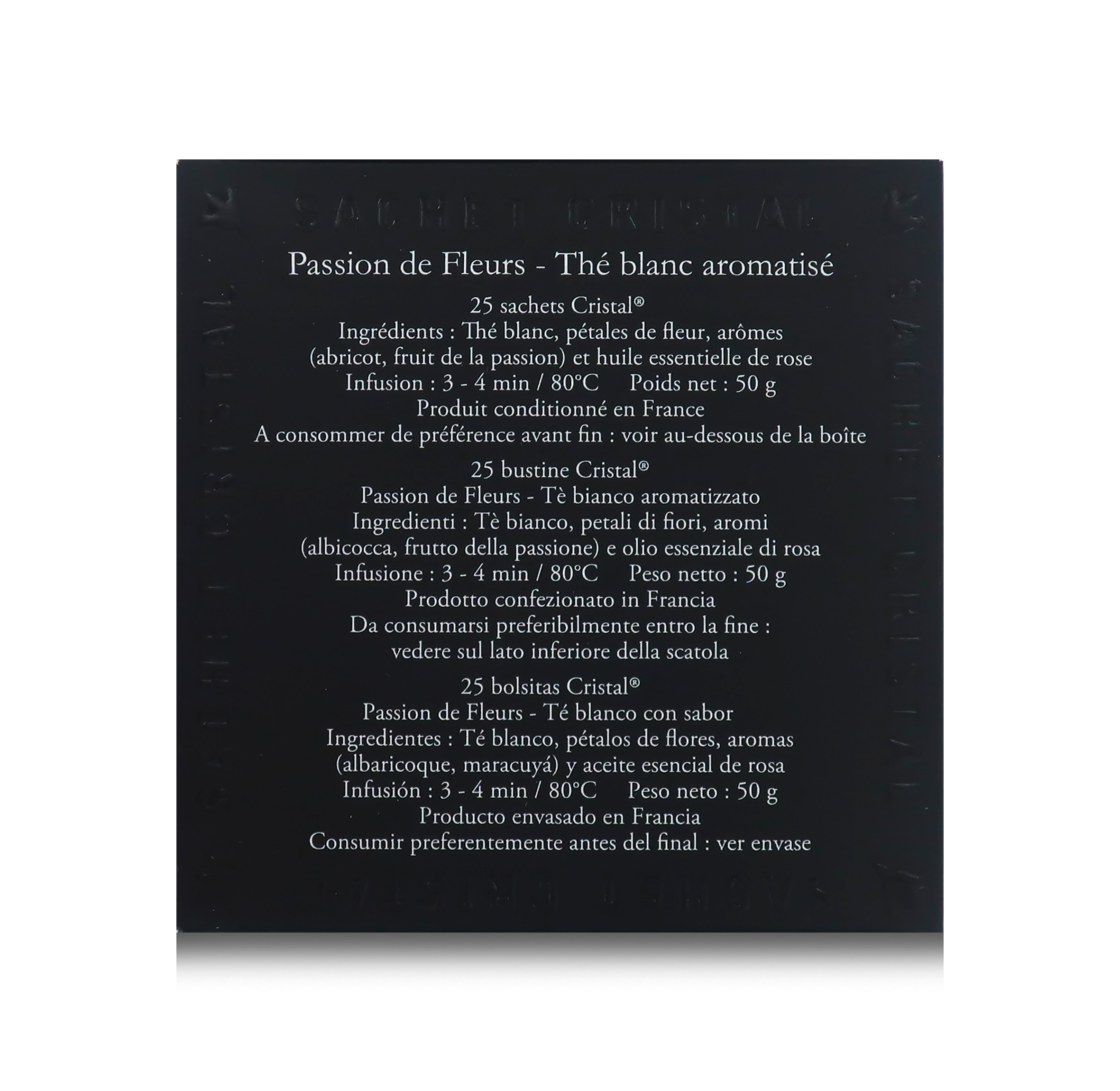 "Passion de Fleurs" è un delicato tè bianco che vanta aromi di rosa, albicocca e frutto della passione. I petali di rosa in esso contenuto gli conferiscono una ancora più accentuata nota floreale.