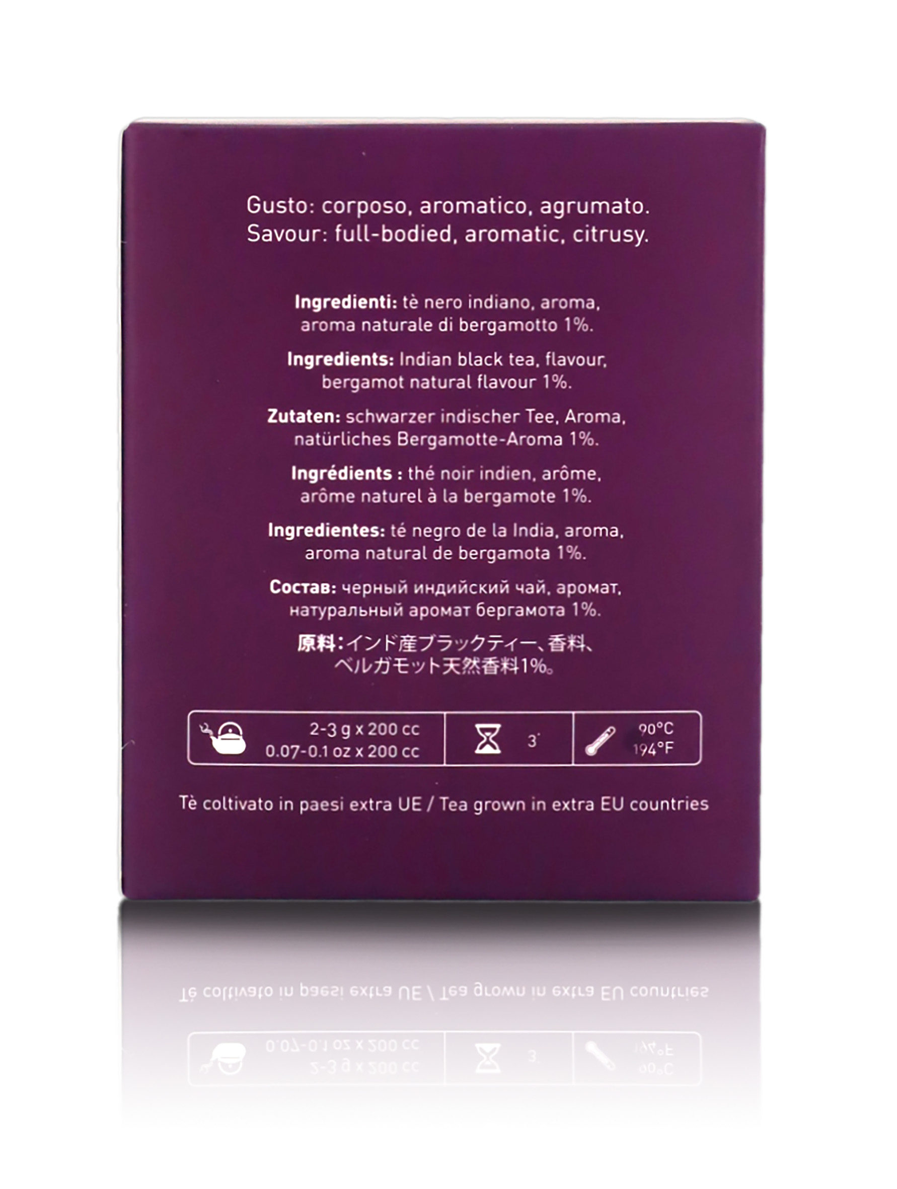 Ingredienti: Tè nero Darjeeling, aroma naturale di bergamotto, aromi.
