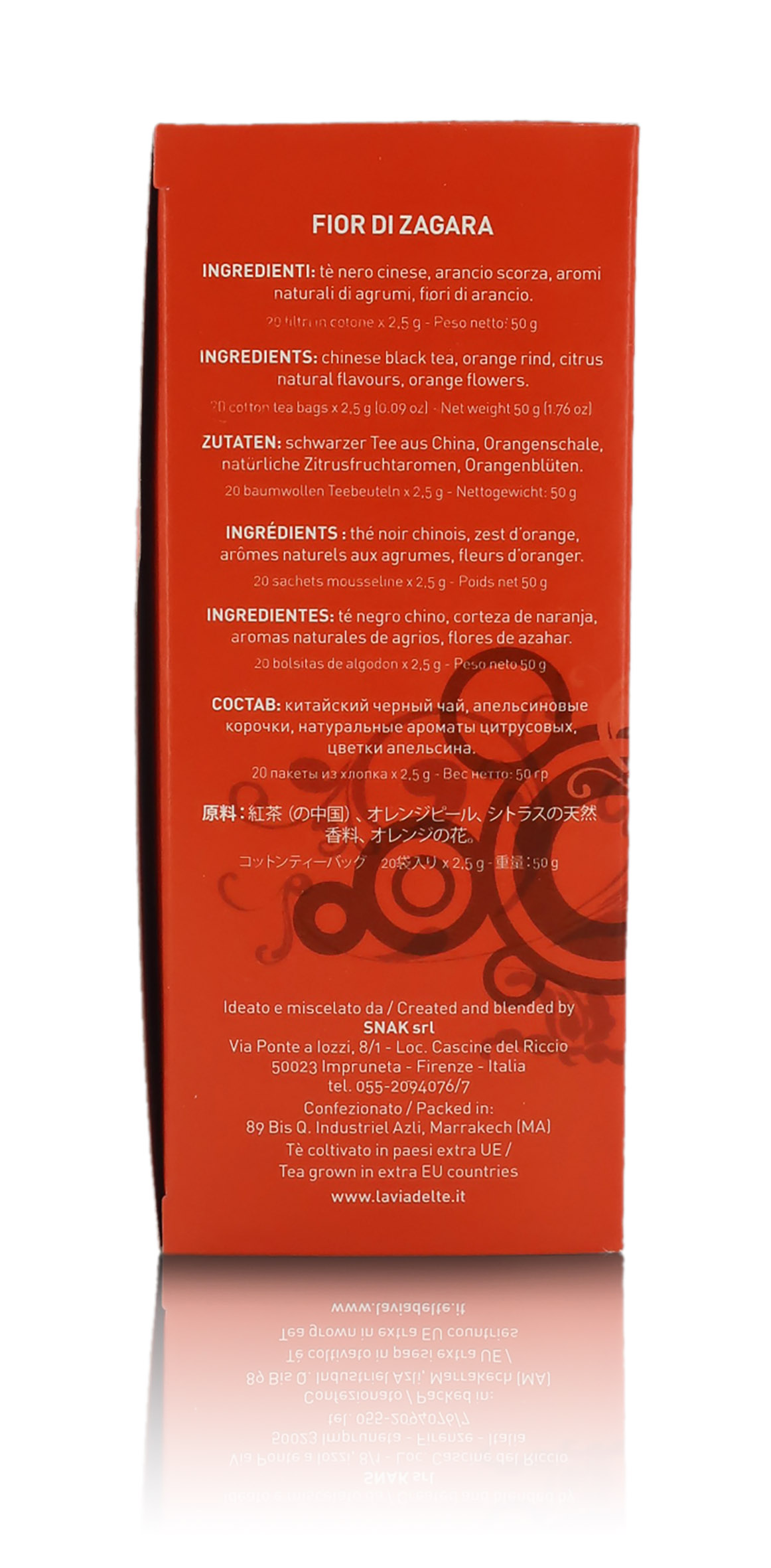 Ingredienti: Tè nero, arancia in scorze, aromi naturali di agrumi, fiori d'arancio.