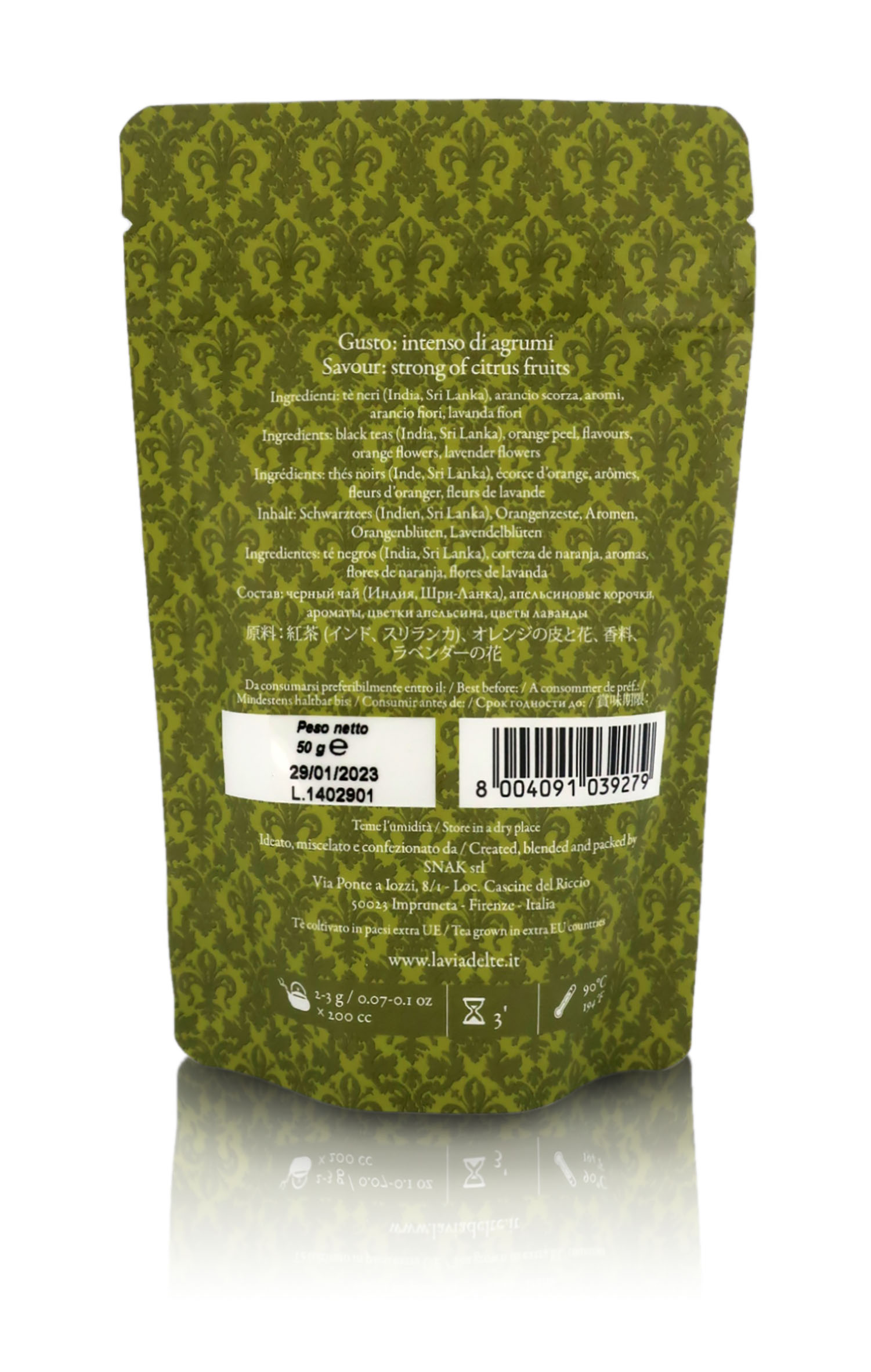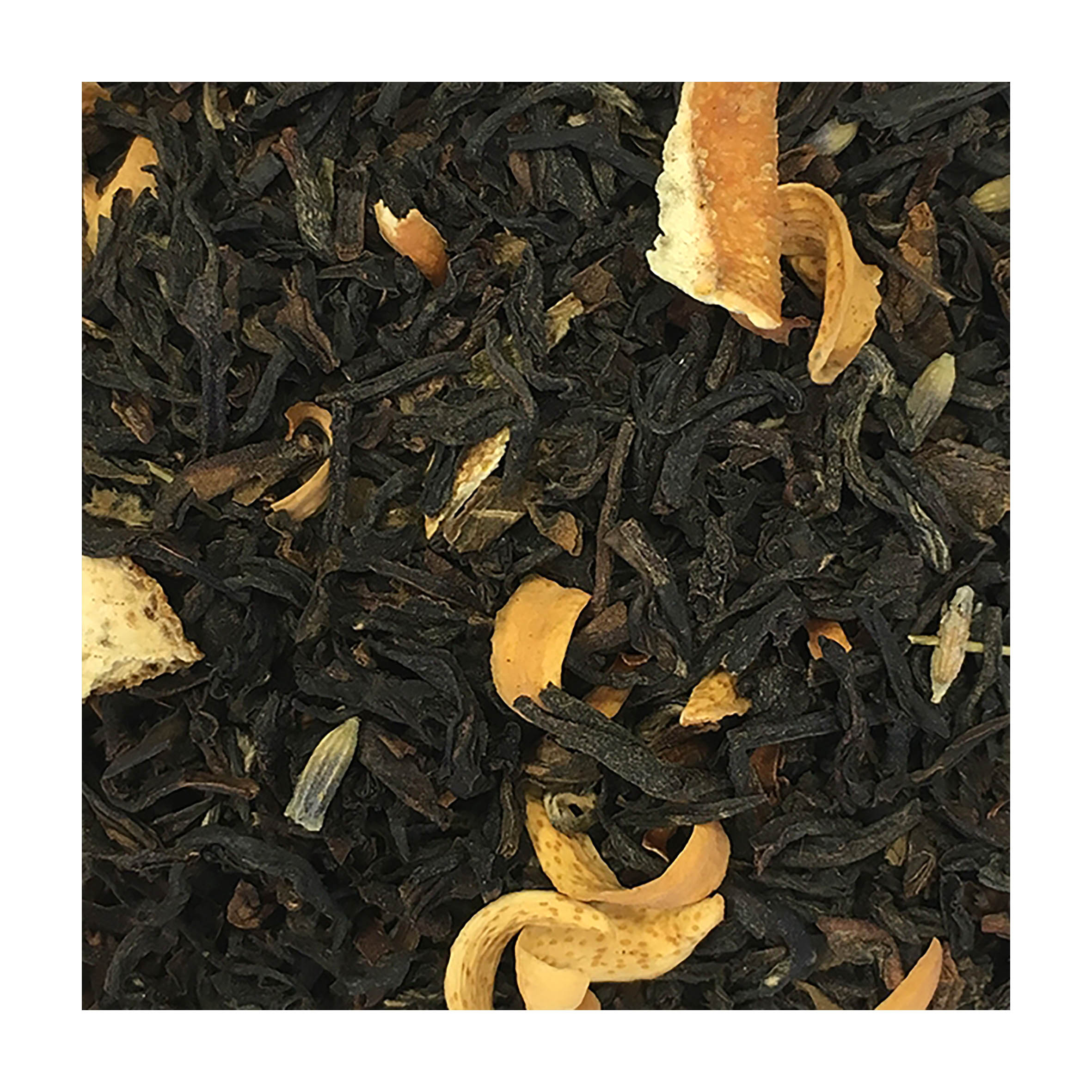 Ingredienti: Tè nero indiano, tè nero, aromi, scorza d'arancia, fiori d'arancio, lavanda.