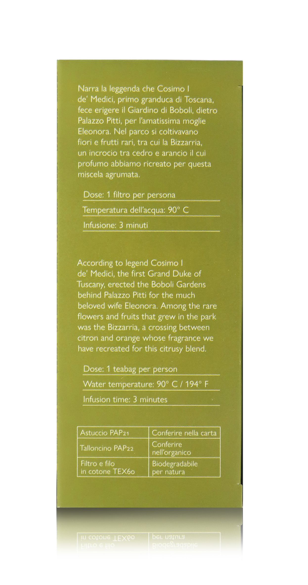Tè in bustine di cotone, realizzato dai maestri del te (tea blender) de La Via del Tè, che si sono ispirati alla bizzaria (mix tra cedro e arancio), una tra le specie rare che popolavano il giardino di Boboli. La miscela è a base di tè nero indiano, arricchito con fiori di lavanda, scorza d'arancia e fiori di arancio. In tazza, la bevanda è di colore arancio scuro, con sapore pieno e morbido, dal piacevole e fresco retrogusto di agrumi (cedro, arancio).