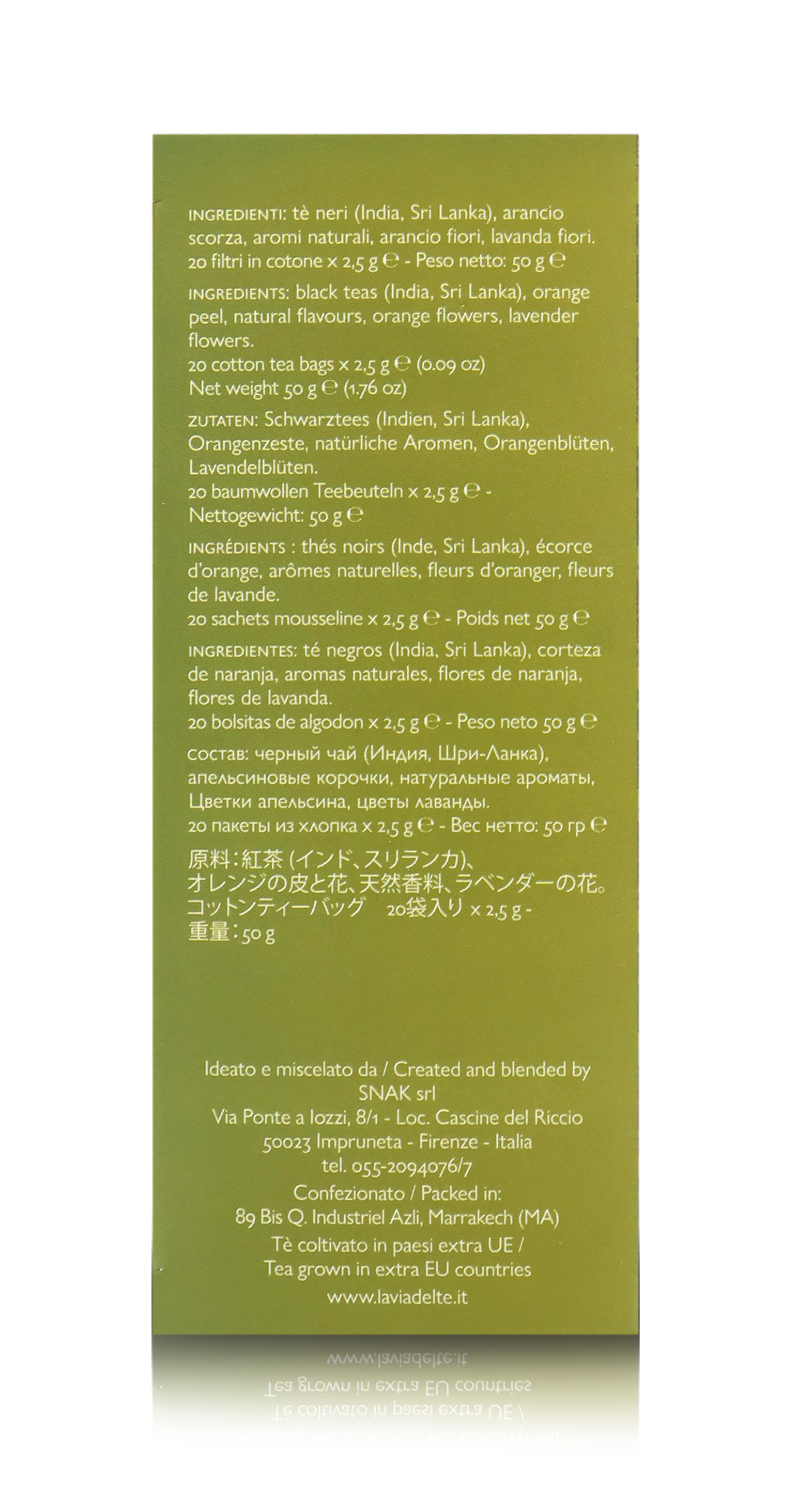 Ingredienti: Tè neri (India, Sri Lanka), arancia scorza, aromi naturali, arancio fiori, lavanda fiori.