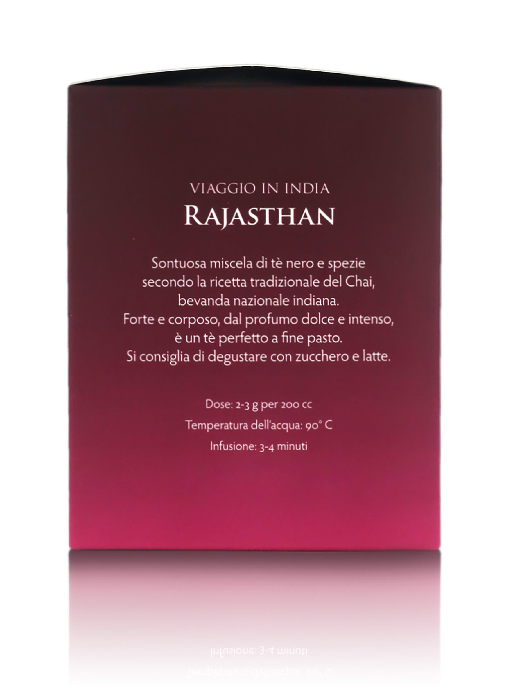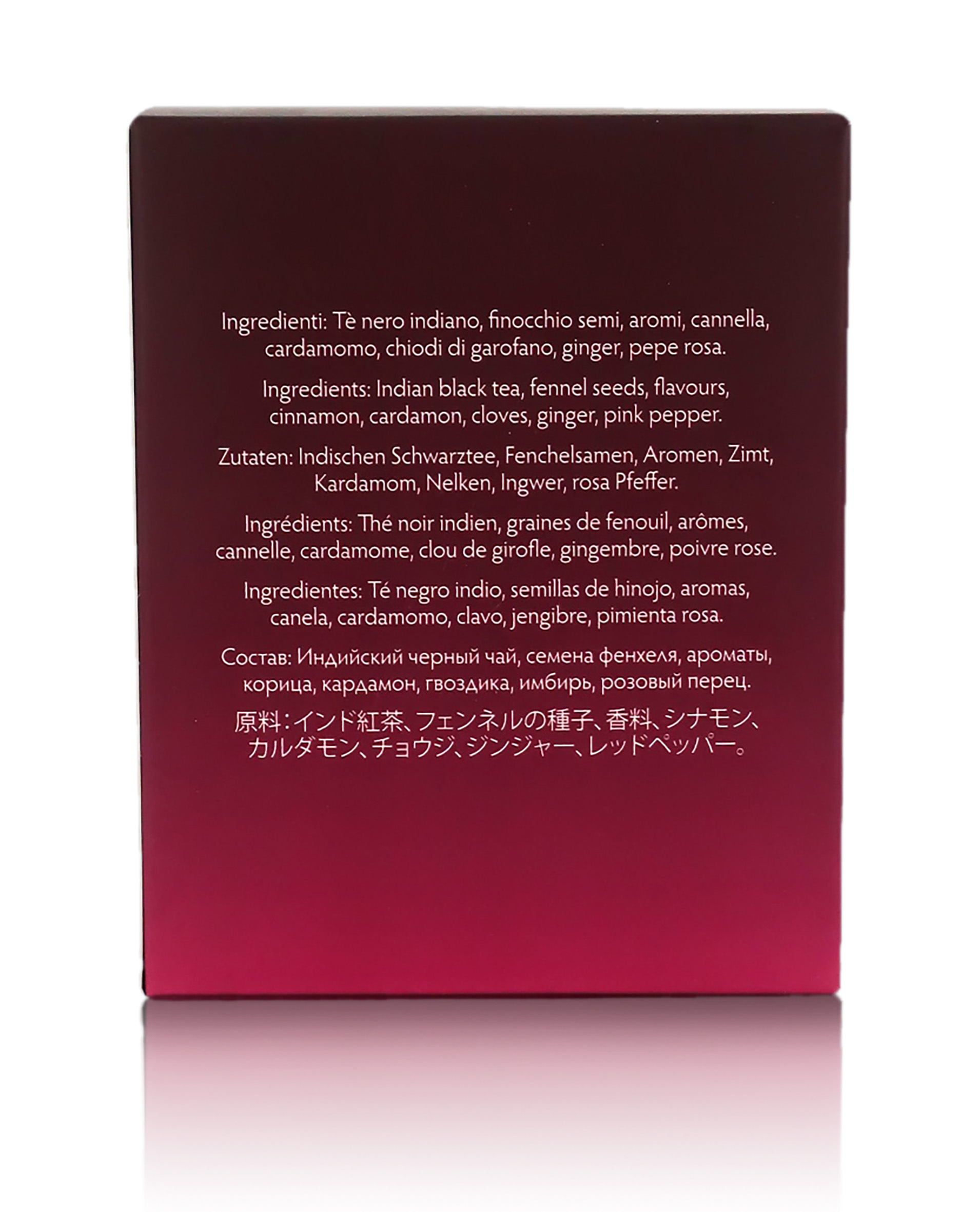 Ingredienti: tè nero indiano, semi di finocchio, aromi, cannella, cardamomo, chiodo di garofano, ginger, pepe rosa.