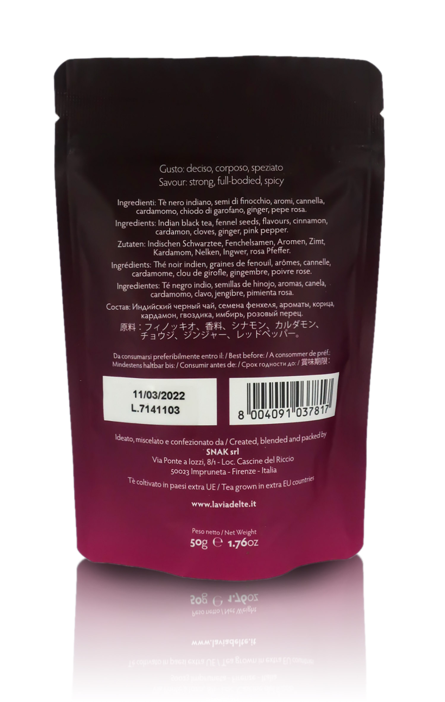 Ingredienti: tè nero indiano, semi di finocchio, aromi, cannella, cardamomo, chiodo di garofano, ginger, pepe rosa.